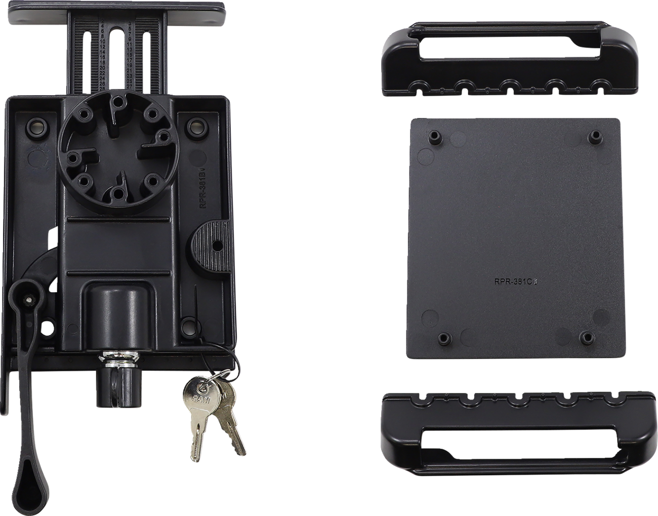 Back plate can support various size support cupsLocking mechanism for theft deterrenceSupport cups contain open slots to accommodate for tablets of various sizesSpring loaded tension provides secure support and quick release for your tablet