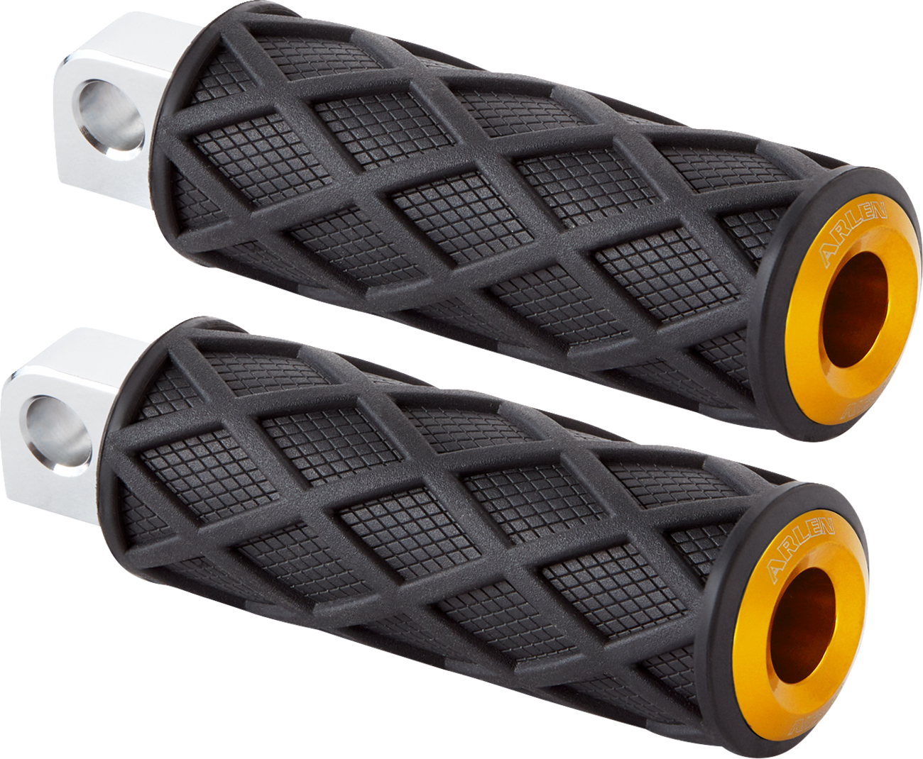 Features a diamond rubber pattern with integrated knurling inside each diamond shaped pocket resulting in foot traction CNC machined billet aluminum end caps with laser engraved Arlen Ness logo Forged clevis and internal structure for optimum strengthReduced shorty length for increased ground clearance