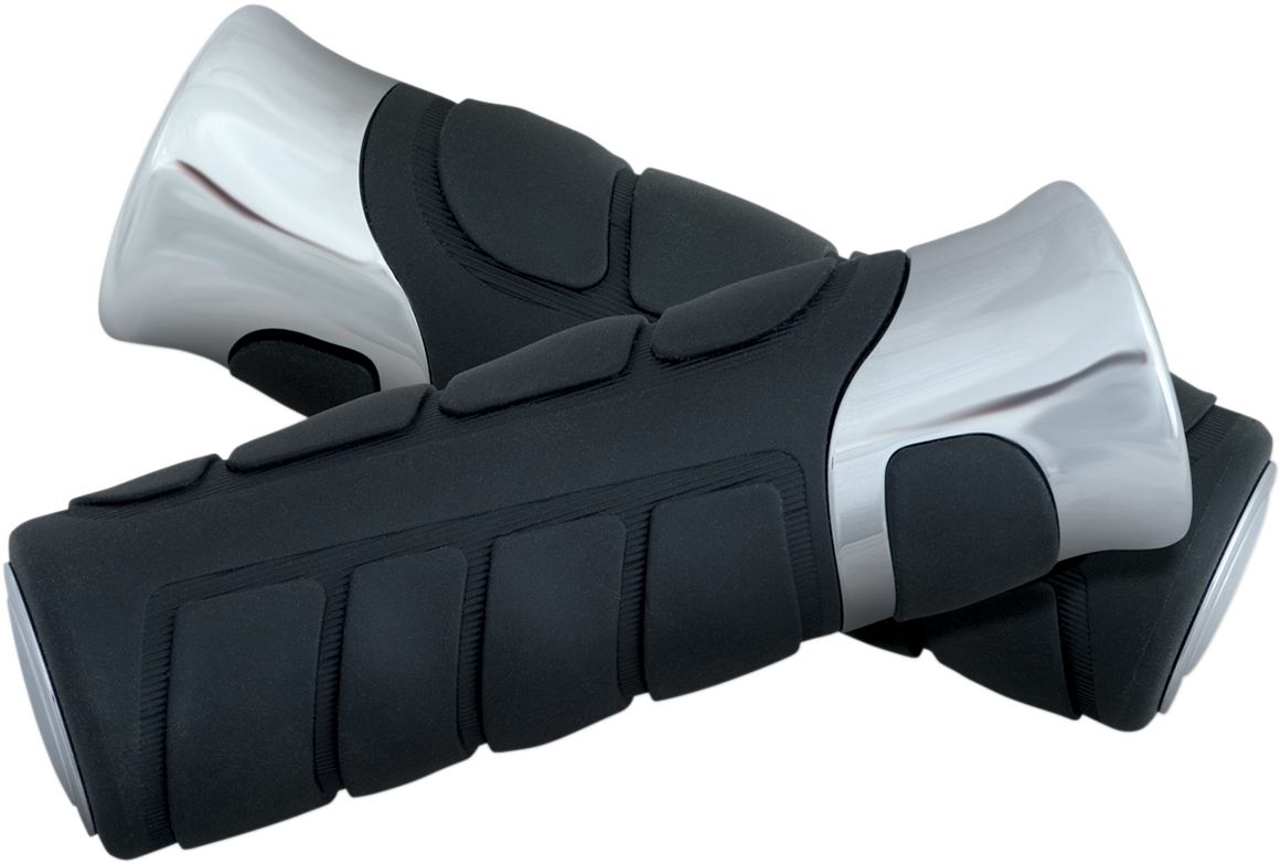 Grips combine the right amount of chrome to give rubber grips a good nameMade from highly durable Thermoplastic Rubber (TPR) rubber with a cushy feel and contoured finger designContoured chrome trim encases the raised thumb position area, adding not only comfort but styleEnds are finished with a decorative chrome trim piece that can be removed for open-ended grip needs1-5/8" o.d.