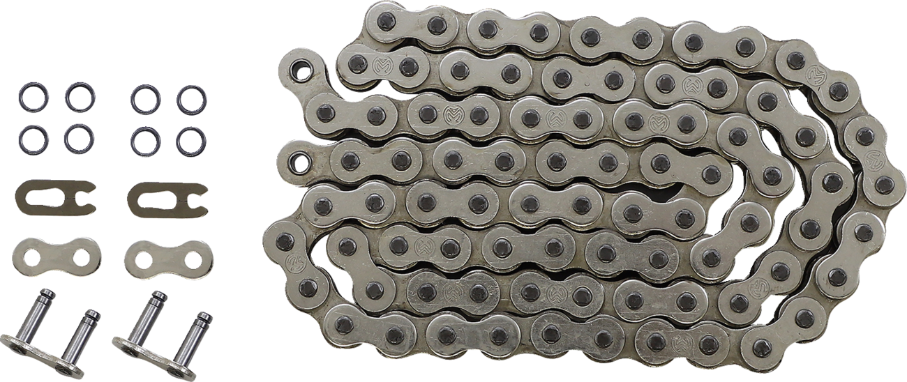 O-ring chainExtra-high-tensile-strength link platesRust-resistant nickel-plated side platesVacuum-injected greased chainSolid bushingsRecommended for applications between 350-450ccClip-type connecting link includedReplacement connecting link available