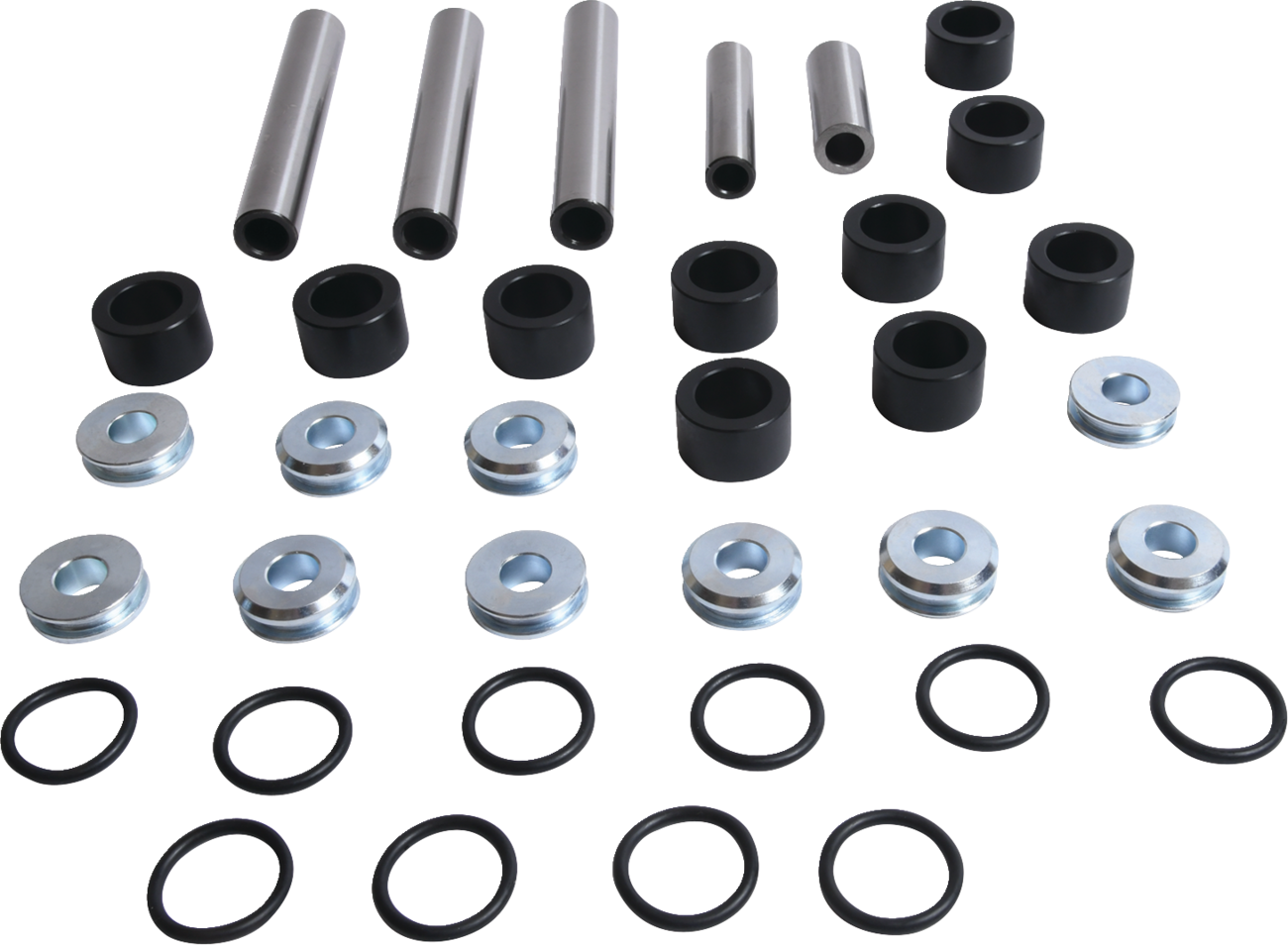Cost-effective kit containing all bearings, bushings, seals, shafts and miscellaneous components to repair the rear upper and lower A-arms and knuckle