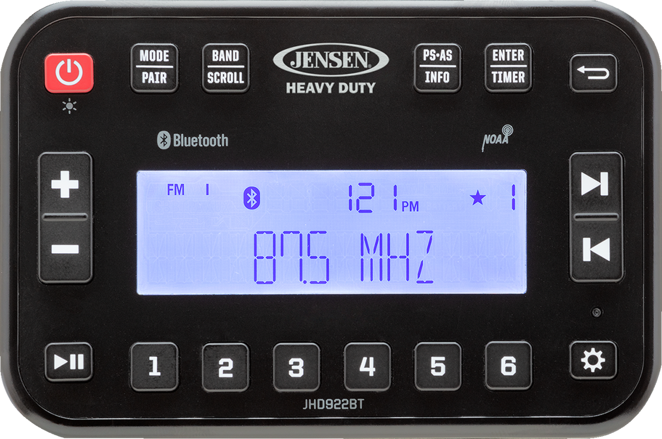 180 W max power (45 W x 4); 100 W RMS (25 W x 4)Bluetooth streaming audio Weather bandAM/FM tuner with 30 presetsAudio settings (volume/bass/treble/balance/fade)Toggle switch between day and night displayDaylight-readable, segmented LCDTwo-wire power with non-volatile memory and clock supportLow battery alertWork time