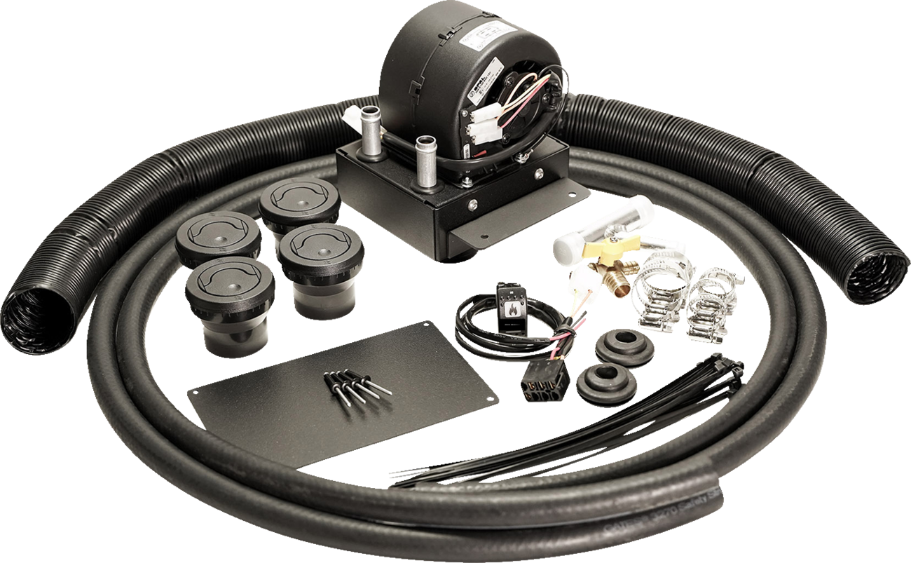 12 volt universal cab heater kit for UTVs with 1" (2.54 cm) and 3/4" (1.9 cm) radiator hosesQuick and easy installationTypically installs in about an hourWater operatedMade in the USASpecs