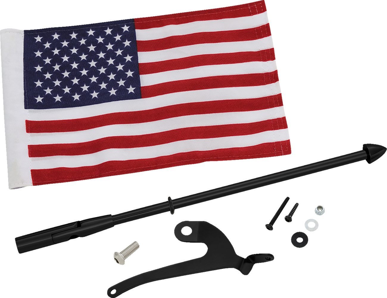 Conveniently folds forward allowing them to tuck out of the way for easy cover placement Comes in either a right or left mount, so you can choose the perfect side or get them bothA longer screw and nut is included to bolt through the inner trunk shell for a secure fit10 cant allows a slight rear angle and mounts to two existing fairing hole mountsComes with 6" x 9" US flag and all required hardwareFlag pole supports flags upto 8-3/4" tall and comes with satin black mountsSpecs