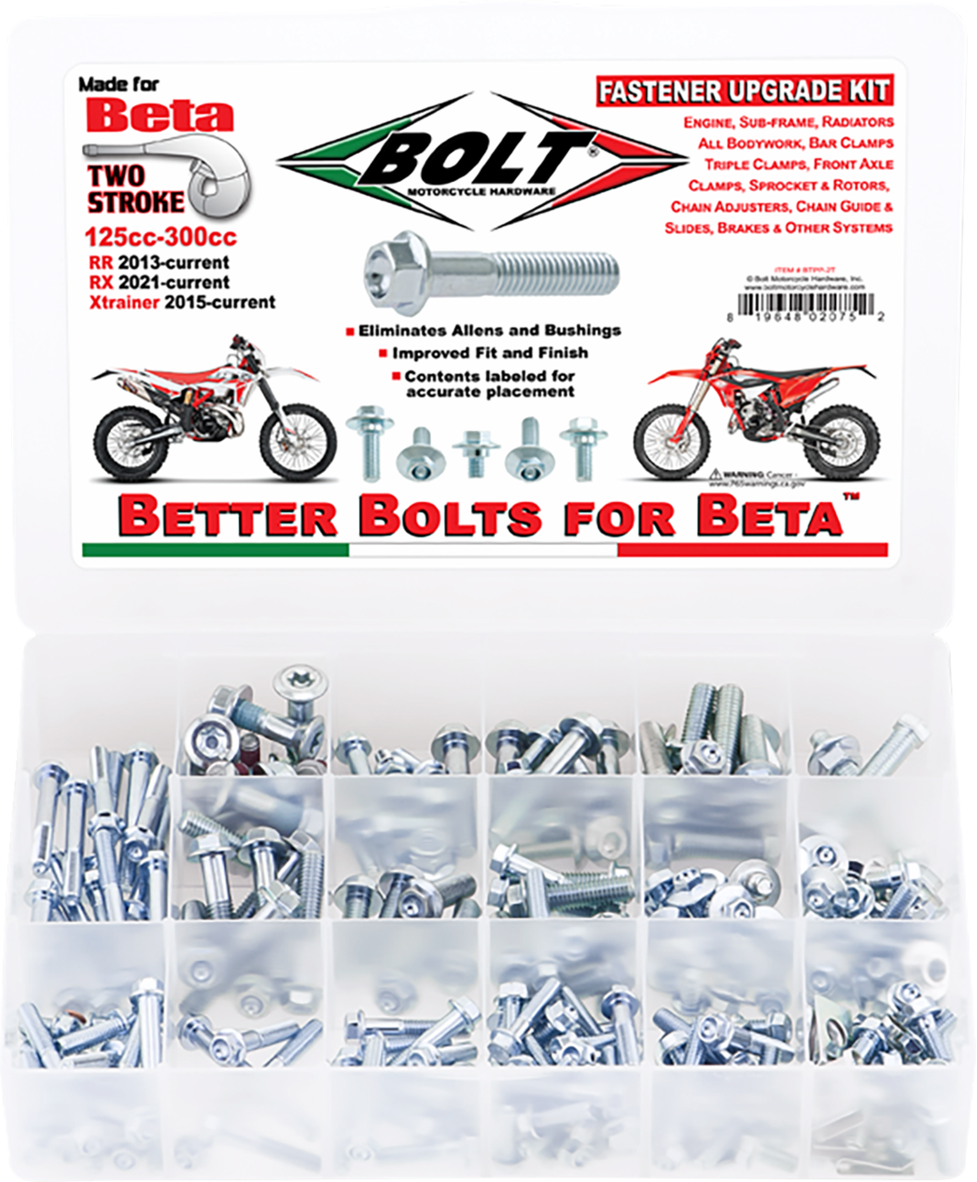 Fastener upgrade kit for Beta is a comprehensive kit that covers: engine, body work, bar clamps, triple clamps, front axle clamps, sub-frame, sprocket, rotor, radiators, chain adjusters, chain guide and slides, brakes and more