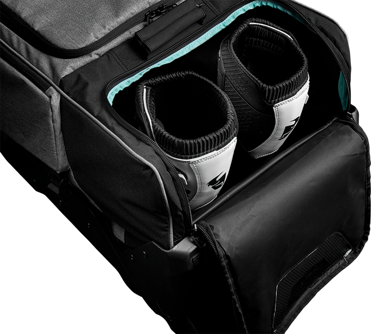 TPR ventilation throughoutPU Backed boot compartment for durability and cleaningMicro fleece lined helmet and goggle pocketRoll-out changing matMesh pockets along both sides of main compartmentLarge main compartment is ventilated on both sidesRetractable push button handle for ease of movementDurable reinforced handlesOversized rolling wheelsCinch straps to compress bag height1200D Ballistic polyester shell, 210D polyester liningDurable molded baseDimensions: 37”L (93.98 cm) x 16-3/4”W (42.55 cm) x 17.75”H (45.09 cm)