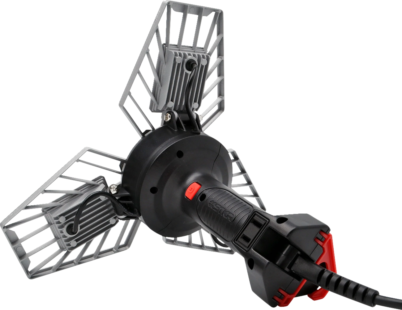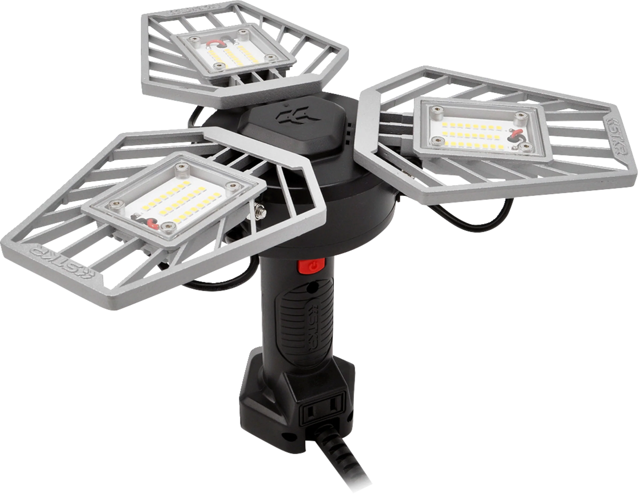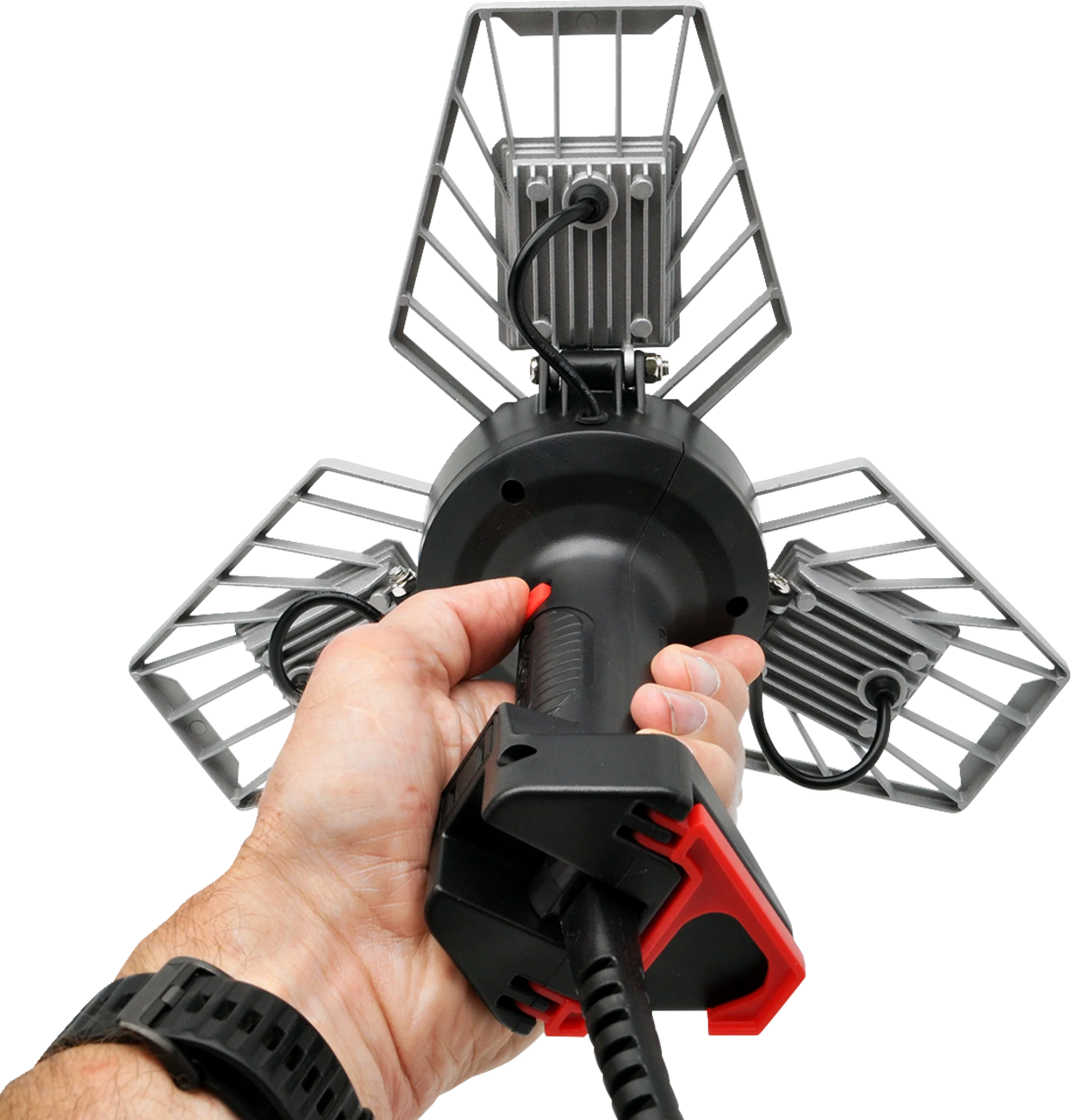Quickly transform from a 360° drop light, into an omni-directional shop light, and any light pattern in-between. This adaptability offers a wider variety of more useful light arrays in comparison to traditional lightingThe base includes a robust hook to hang the TRiLIGHT shopLight V2 at a construction site, or from the hood of a carCool to the touch LED heads with 50,000-hour LED lifespanLight output: 5000 true lumens from 3 adjustable aluminum headsVoltage: 110V-240VPower consumption: 50 WattsSize [folded]: 7.5" x 6.5" x 8" (19.1 cm x 16.5 cm x 20.3 cm)Cord length: 9' (2.7 m)110V outlet in the handleModes: On/OffWeight: 1.5 lb (680 g)1 year warranty