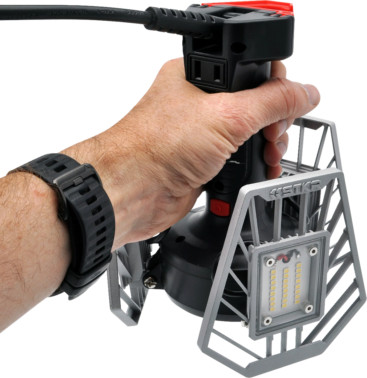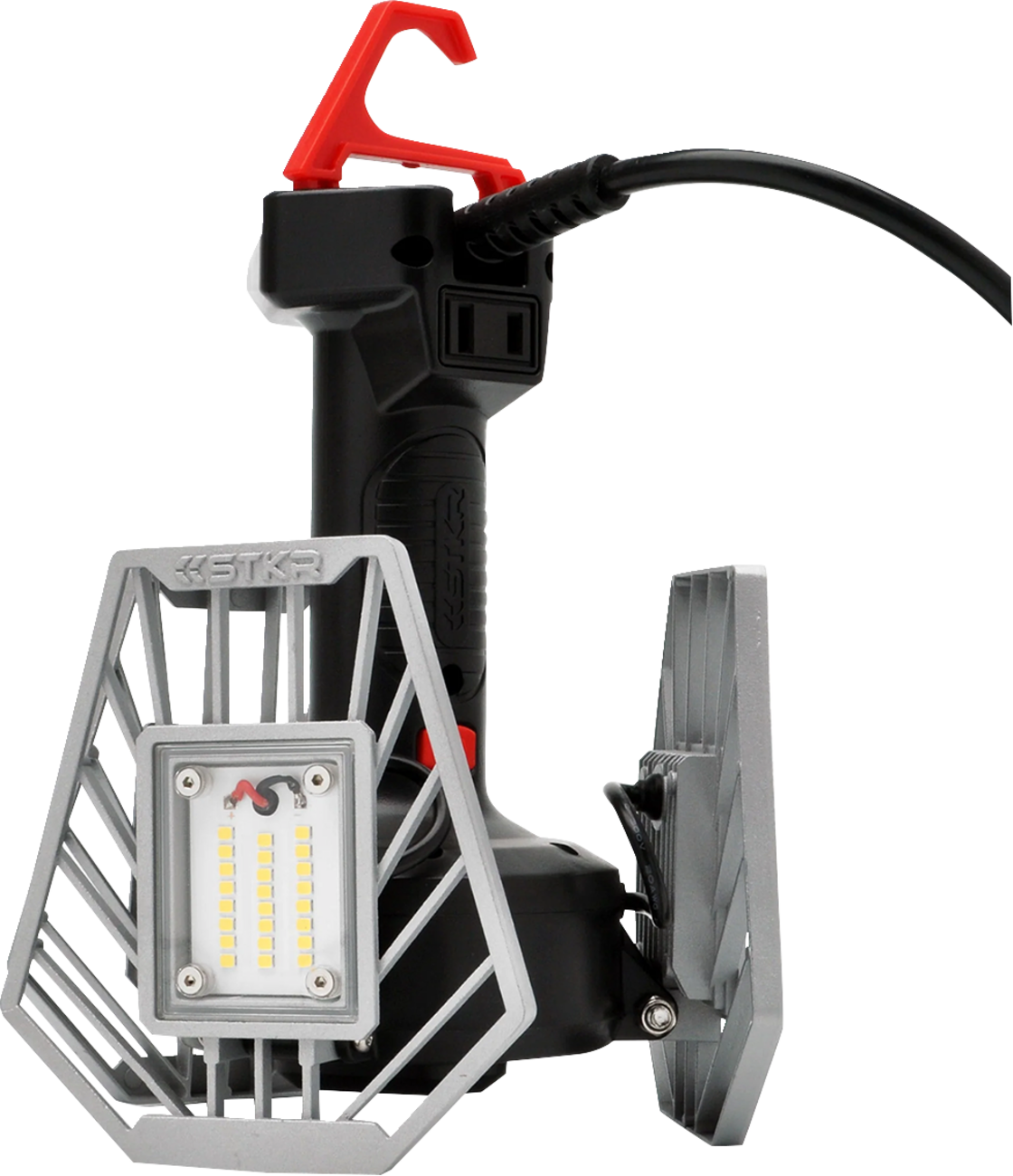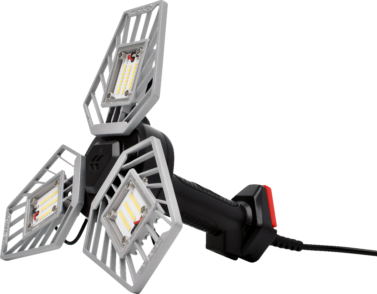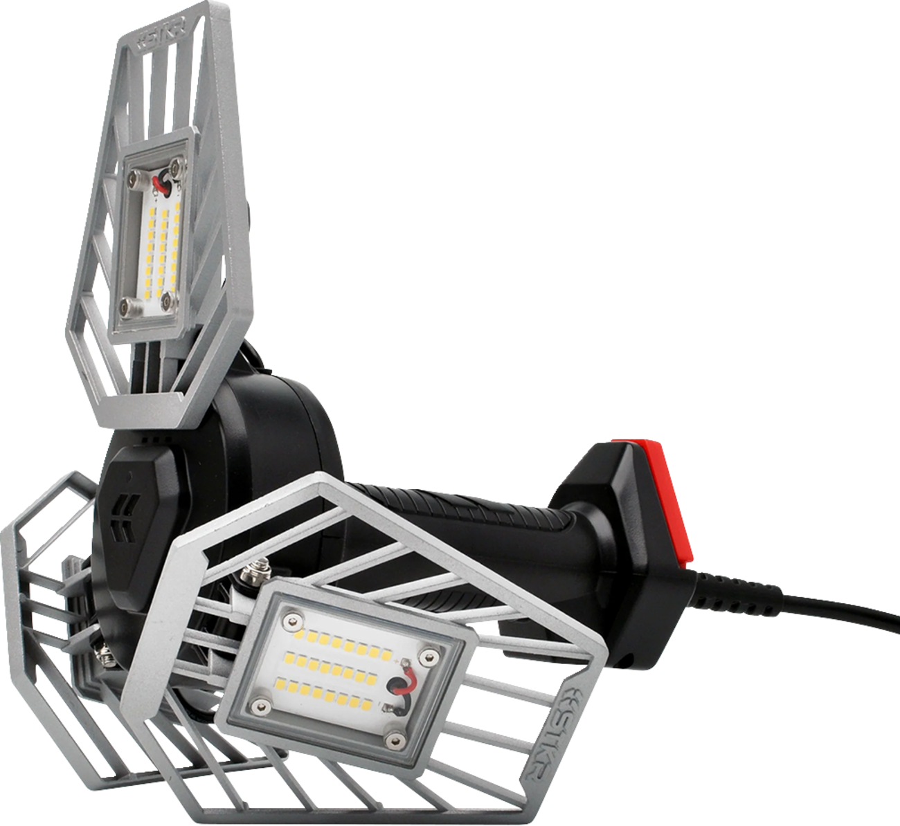 Quickly transform from a 360° drop light, into an omni-directional shop light, and any light pattern in-between. This adaptability offers a wider variety of more useful light arrays in comparison to traditional lightingThe base includes a robust hook to hang the TRiLIGHT shopLight V2 at a construction site, or from the hood of a carCool to the touch LED heads with 50,000-hour LED lifespanLight output: 5000 true lumens from 3 adjustable aluminum headsVoltage: 110V-240VPower consumption: 50 WattsSize [folded]: 7.5" x 6.5" x 8" (19.1 cm x 16.5 cm x 20.3 cm)Cord length: 9' (2.7 m)110V outlet in the handleModes: On/OffWeight: 1.5 lb (680 g)1 year warranty