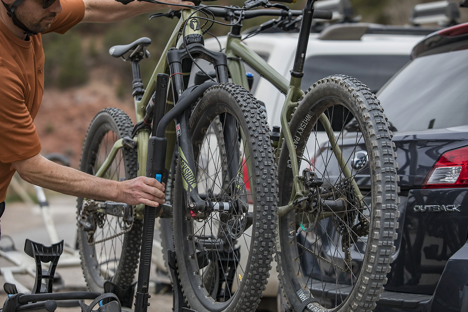 Carries two bikes, up to 60 lb.; 2” variant is expandable to 3 bikes up to 45 lb. each, with Add-On (available from Rocky Mounts)No contact with frame, secures bicycle by front wheelCarries road tires up to 5.0” fat bike tires, and diameters from 20” to 29”Compatible with bicycles wheelbases from 34” and 49”Folds flat against the vehicle, and tilts down 30 degrees to allow for hatch access2” variant comes with anti-wobble boltIncludes locking hitch pin, cable lock, and standard lock pods, keyed alikeMetal components are EPD treated prior to powder coating to ensure weather and dirt resistance to help maximize the life of the rackNot for use with fender equipped bicyclesRack weight 39 lbs (shipping weight 51 lbs)If you want to fit both 1.25” and 2” size hitches, get the 1.25” and an adapter sleeve