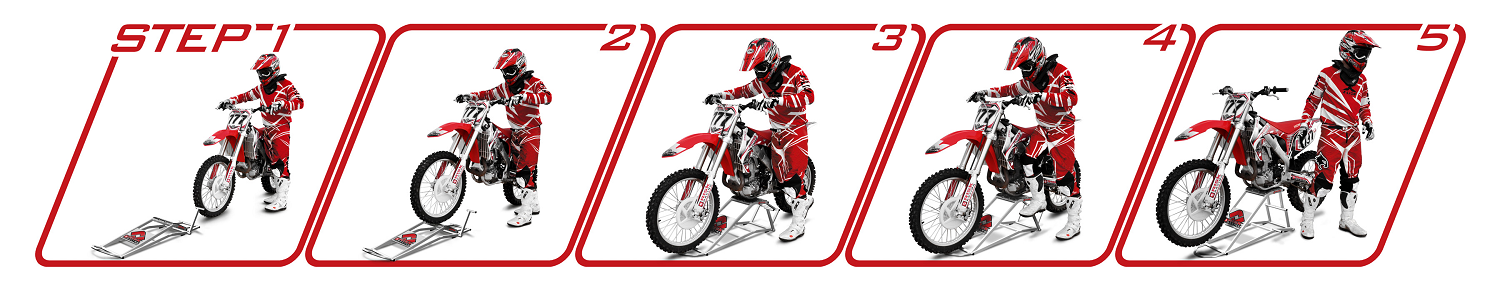 Simply push or ride the bike onto the flattened lift and the lift does the restSturdy construction and powder coat finishWorks with MX-specific bikes 85cc-450ccLockable in the up or down positionLarge mat on top to grip the bikeLightweight - only 17 lbOil drain hole