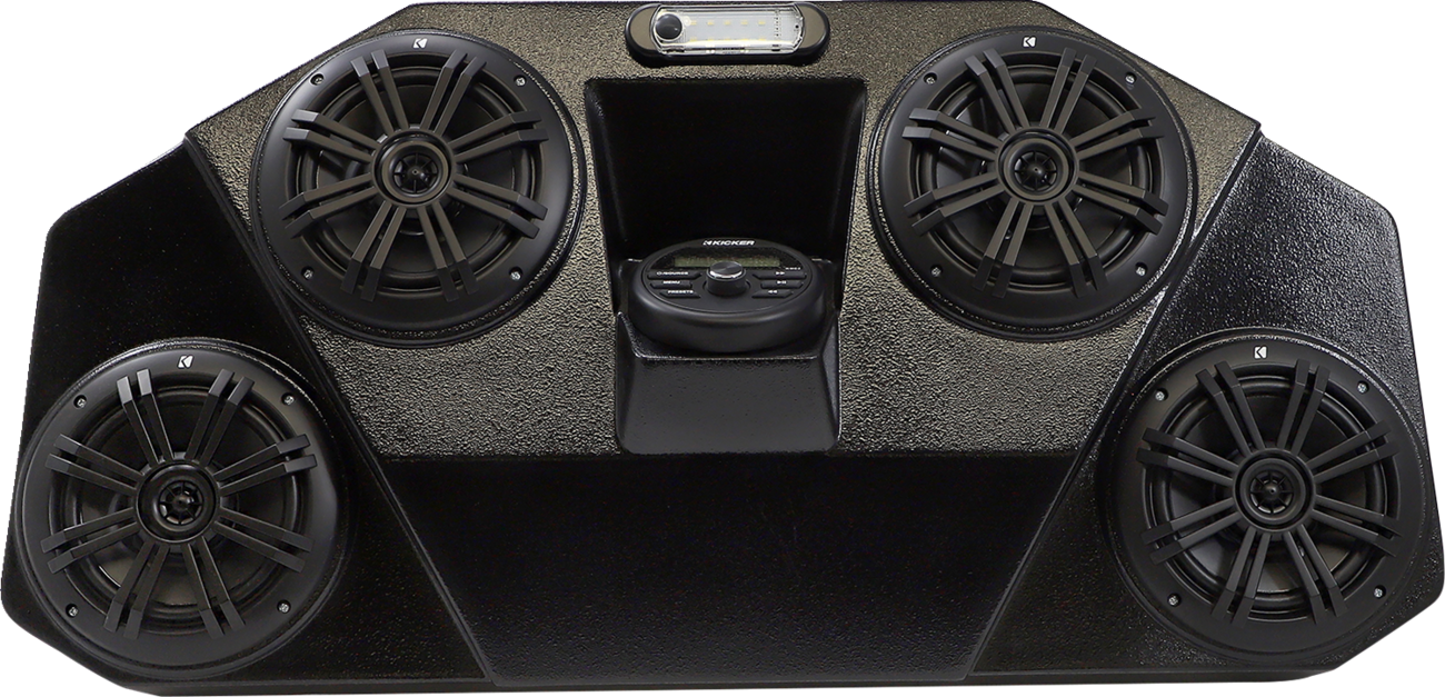 Surface-mounted LED dome lightUltra-bright, high output150° light dispersionSealed on/off switchKicker® KMC2 multimedia gauge-style marine receiver with Bluetooth®AM/FM digital tuner (LED lights may cause signal interference when activated with AM/FM tuner)200-watt peak power4 Kicker® 6" KM-Series speakers4-ohm voice coils1/2" PEI tweetersMolded using robust UV resistant materialsSealed motor structureTuned to sound great while driving/ridingUV-treated polypropylene woofer with Santoprene® SurroundPlug-and-play harnesses with model-matching connectorsInfused resin process layered with directional fiber orientation for ultimate rigidity and strengthRigid design improves sound quality for the cleanest bass and crystal-clear highsCompatible with factory roofsSpecs