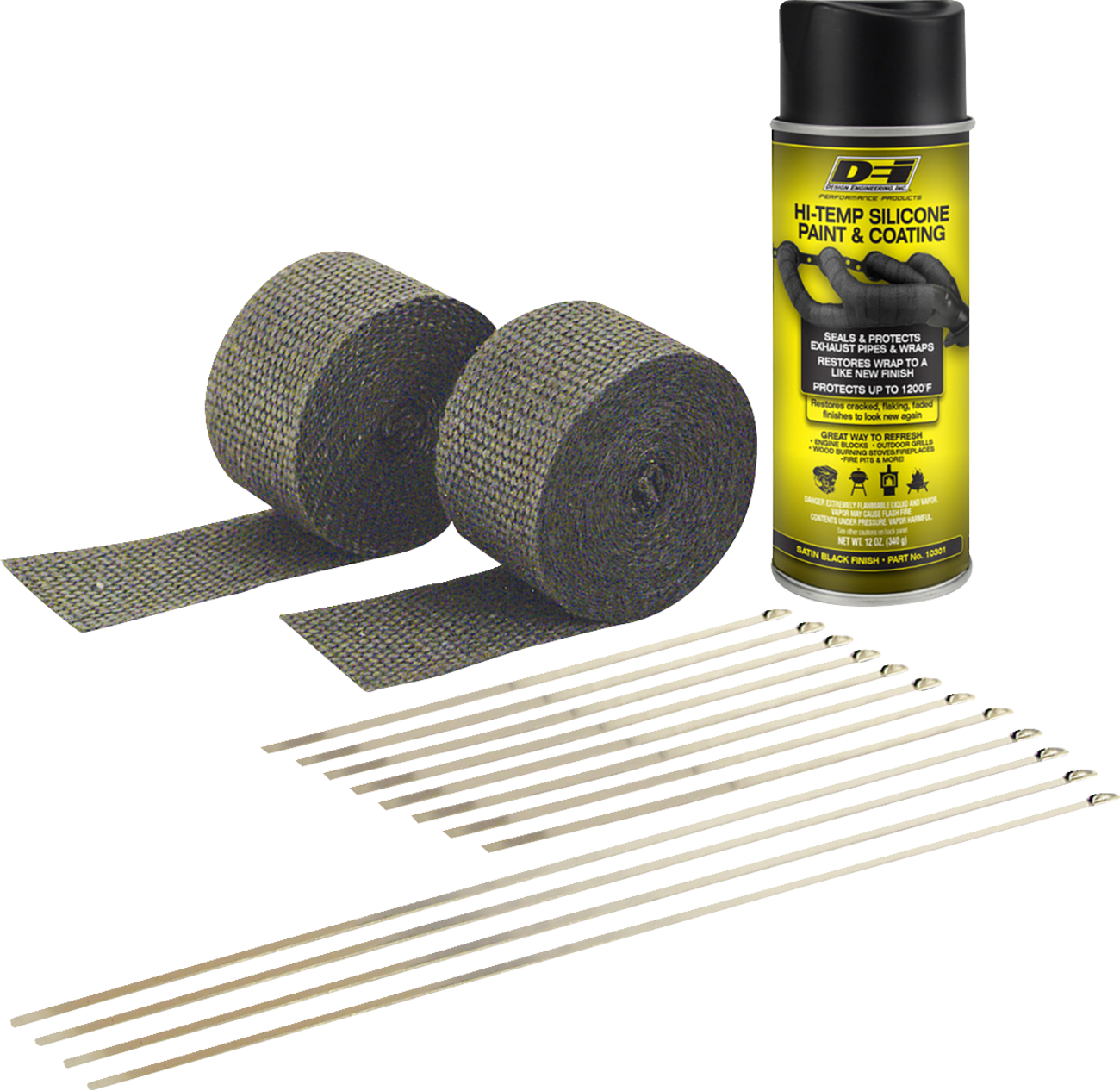 A simple and effective way to control heat, protect against serious leg burns and improve performanceKit includes two 2" x 15' rolls of black exhaust wrap, eight 8" & four 14" stainless steel locking ties to secure wrap and Black HT silicone coating spray that penetrates, seals, protects and preserves wrap