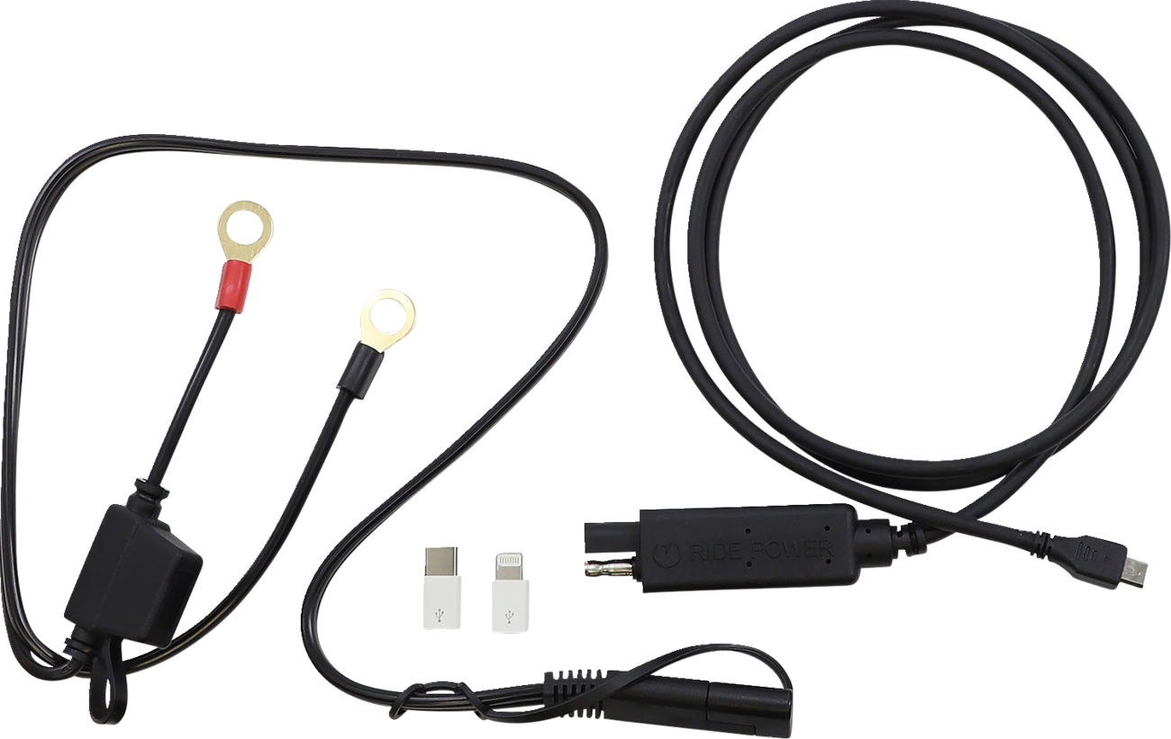 This phone charging cable kit with intelligent electronic charging and data blocking technology offers fast, reliable charging with smart electronicsWater resistance and short circuit protection2' SAE to Ring terminal battery connector cable with a 7.5a in-line fuse4' SAE to male micro USB cableMicro USB to lightning adapterMicro USB to USB-C adapter