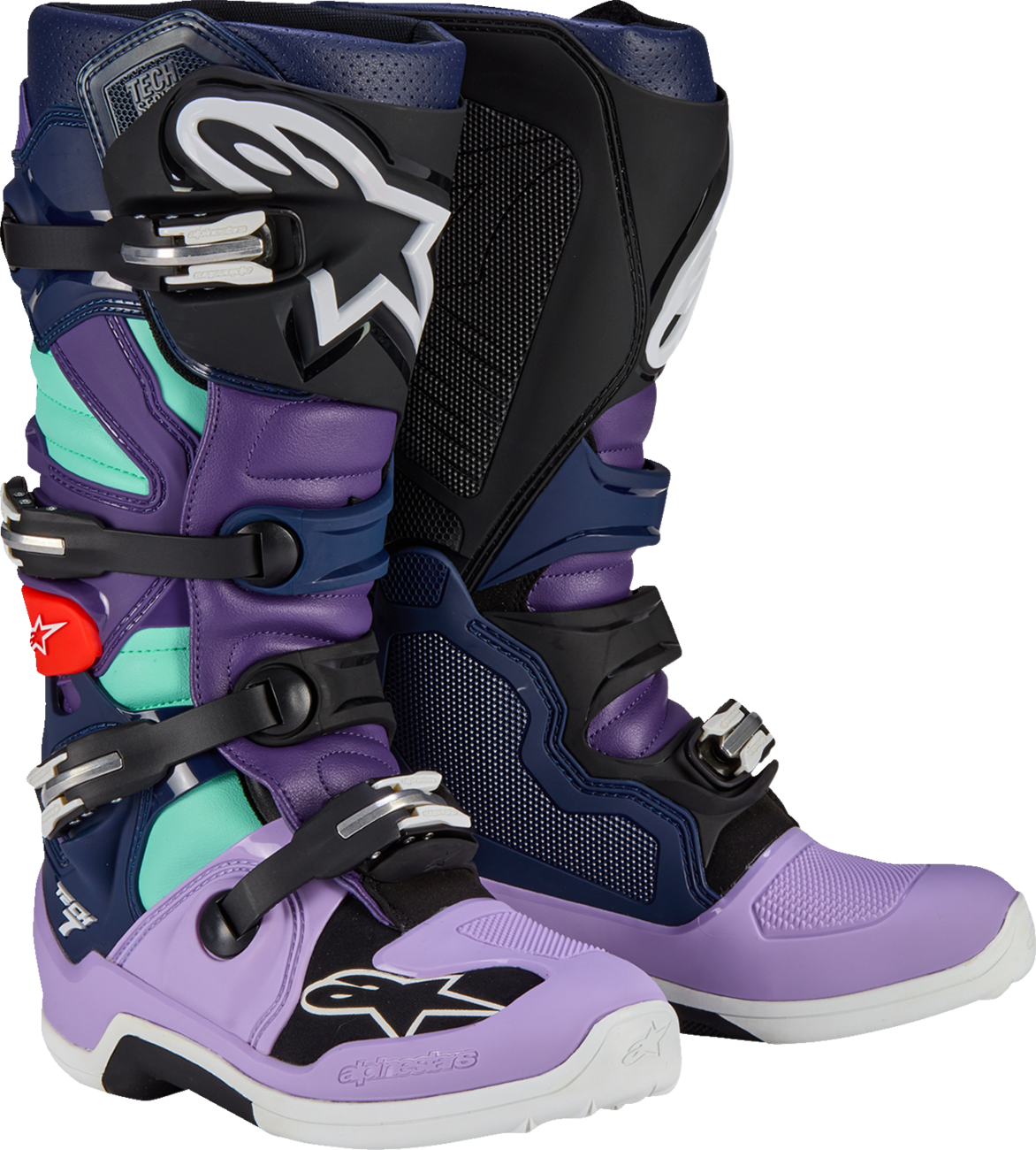 Boot chassis designed with an ergonomically profiled forefoot and lower toe-box to provide easier shifting and improved rear brake feel and controlShell is highly resistant to abrasion and impact, adds to the boots overall durability and improves boots streamliningDual compound sole is seamlessly integrated into the base structure for superior durability, high performing rubber grip patterning, and feelDual compound, removable anatomic footbed includes EVA and Lycra top for comfort and support ensures even weight distribution and reinforced heelSole and footpeg insert are replaceableUpper constructed from innovative microfiber material that is flexible and abrasion resistantUpper material is reinforced with PU (Polyurethane) for high levels of water-resistance and durability and improved weight-saving performanceMaterial ensures consistent fit even for long term usage and is easy to maintain and cleanTPU (Thermoplastic Polyurethane) ankle protection system incorporating a biomechanical link between the middle and bottom sections of the boot helping prevent damage to the leg by providing progressive force relief for torsional forcesTPU medial side panel incorporates an advanced honeycomb rubber insert and is designed for excellent grip against the bike while guarding against impactWide entry aperture for convenience and allows broad ranging calf fit adjustment and supportTPU shin plate and medial protection are constructed from one single part for greater structural integrity and stabilityAnatomically profiled shin plate features a dual closure system with an internal microfiber flap attached with Velcro for a precise fit closure while the rugged and durable shin plate attached securely with a precision adjustable buckleIncorporating an innovative one-piece injected dual compound foot shell with co-injected hard toe protector and integrated steel shankContoured calf protector plate is injected with high modulus polymer for impact resistance and incorporates Alpinestars developed blade flex system for greater precision control and movement, added protection for heel and Achilles tendon and helps prevent hyperflexionSlim-line buckles include high-impact bridge closures which are cold forged for precision and strength Innovative buckle closure system includes high-impact aluminum bridge closures, with memory settings and a quick release/locking system with self-aligning design for easy, precise closure and improved riding performanceInnovative buckle closure system includes high-impact aluminum bridge closures, with memory settings and a quick release/locking system with self-aligning design for easy, precise closure and improved riding performanceRedesigned instep and Achilles accordion flex zones construction for superior comfort, control and supportExtended microfiber gaiter helps prevent excessive water and dirt entryInternal lining includes anti-slide microfiber suede on the heel to help keep foot in positionSoft foam reinforcement on ankles and collar for long lasting comfort and shock absorption