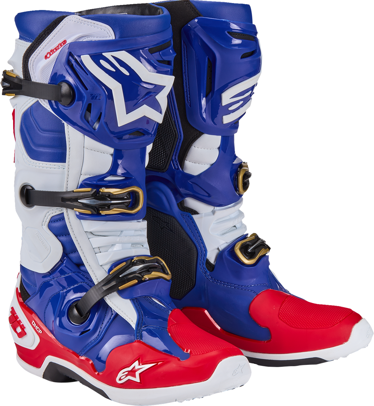 Combines dual front and rear blade connectorsProvides a complete and seamless flexion control system, from the foot shell all the way up to the shin plateEngineered to 'float' freely between the lower and upper boot constructionAsymmetrical, dual pivot arms on boot frameA unique feature is the ankle control system developed in the outer shell construction, allowing natural ankle movement, vertical compression control and improved impact protectionAsymmetrical medial and lateral double pivot system for improved levels of flexibility and precision for both independent and synchronized movementRedesigned dual density Thermoplastic Polyurethane (TPU) rear blade system engineered to prevent hyper-extension while offering improved flex control and impact resistanceDynamic Heel Compression Protector (DHCP), an innovative safety feature which includes a fully integrated collapsible heel area with expanded poly-foam to absorb high impact energies during a crashFeatures lighter, anatomically redesigned medial and lateral torsion armsDouble pivot system allows the Tech 10 to retain its integrity while flexingLow-profile, pull-on design for reduce material build, less weight and to facilitate easier and quicker wearingInnovative flexion inserts work seamlessly with new flex support system for ultimate in performanceTPU protection and shock absorbing padding on the heel and anklesConstructed from a dual density compound and combined with the rear blade systemEnergy dissipating shin plate features a new anatomic design for reduced surface area and weight-savingCompletely redesigned sole with proprietary grip sculpturing to improve foot-peg performance, grip and mud and water run-offExclusive dual-compound sole is seamlessly integrated to the multi-density foot base structure with built-in supportSlim-line buckles include high-impact bridge closures which are cold forged for precision and strengthClosure system features contra-closure, doubling closure security and a quick release/locking system with self-aligning, memory, design for easy, precise closure and improved riding performance and securitySoles and buckles are easily replaceableChassis combines advanced lightweight microfiber and impact and abrasion resistant TPU shellFoot shell features five different compounds in a single lightweight piece to offer strength while maintaining flexibility and structural integritySoft microfiber gaiter helps seal out excessive water and dirt entryPoly-fabric lining with 3D open cell foam incorporates anti-slip suede in heel area, keeping the foot located inside the boot