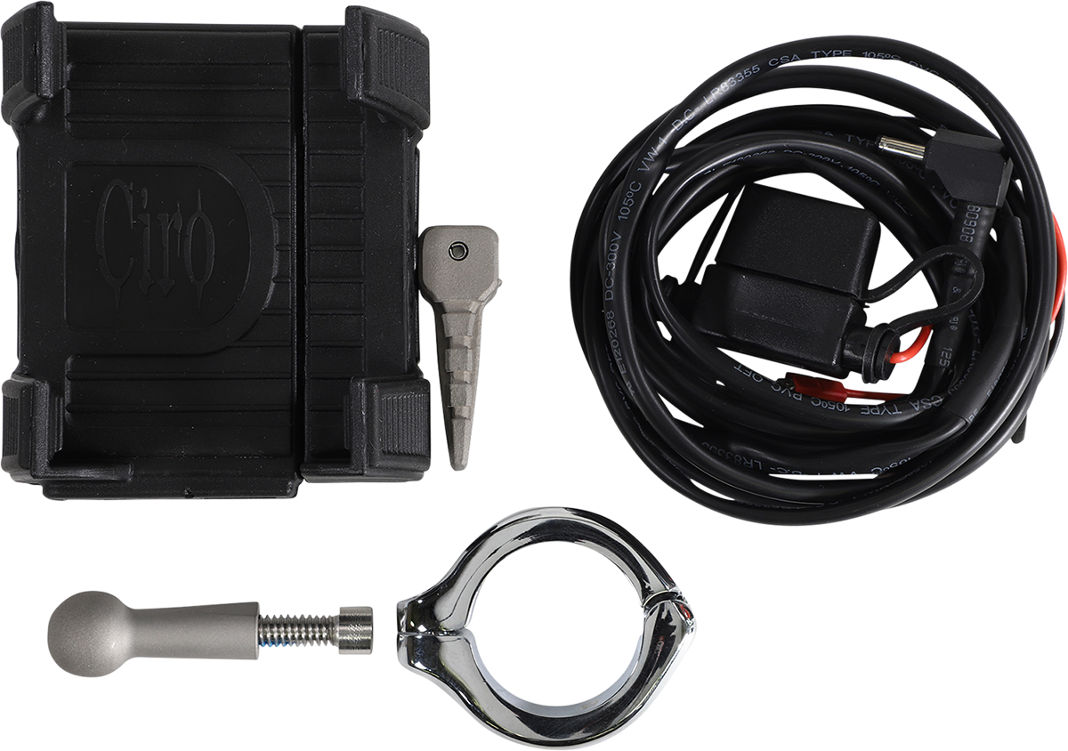 Charger model has 1.3 USB port for on-board charging as you ride (cable not included)Quick and simple ambidextrous design lets you just flip the lever to lock smartphone into the secure rubber molded fingersInfinite adjustment with Ciro ball-mount designIntuitive ball mounting system allows for a broad range of angle adjustmentFit devices from 2-1/8" - 3-1/2" wideAmbidextrous designPhone cable not included