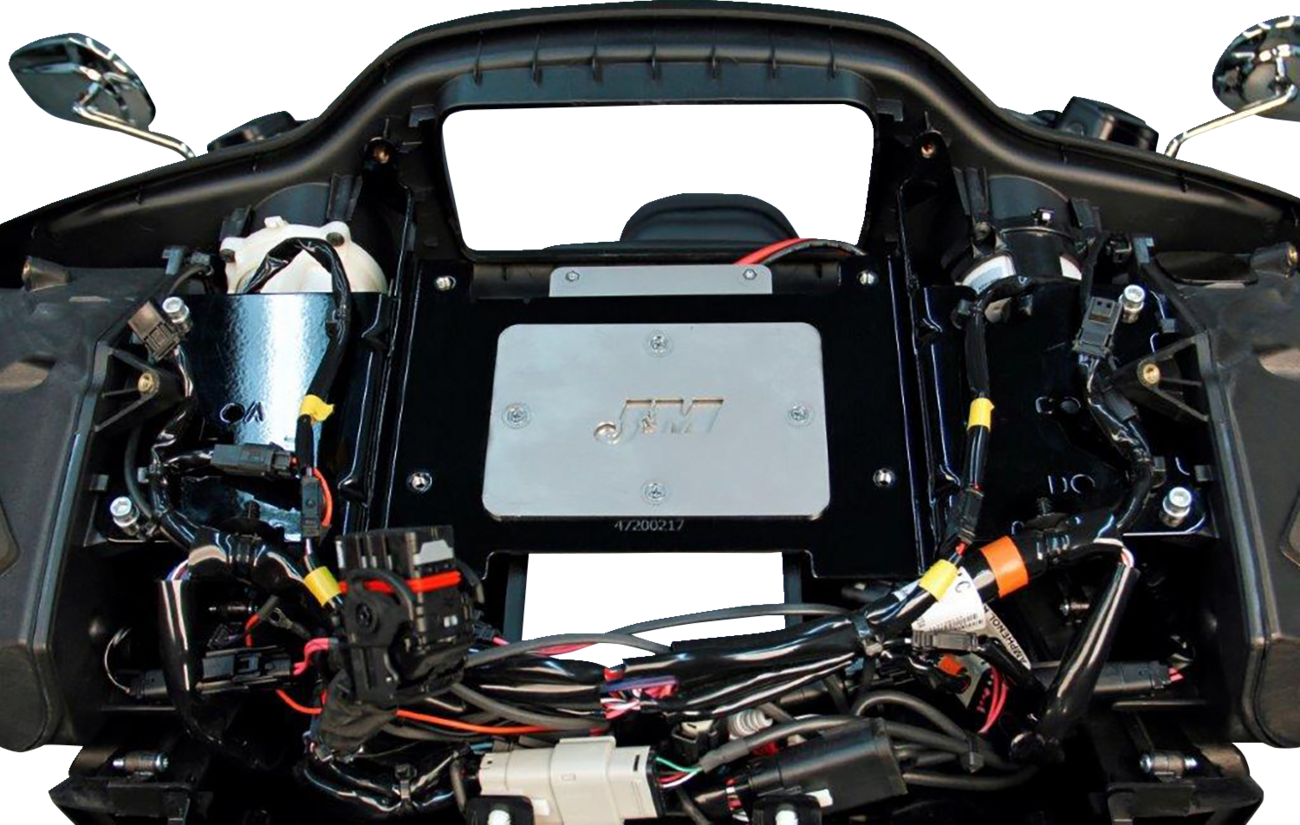 Amplifier mounts to the Lazer-cut stainless steel 2-piece bracket system, to provide solid and secure mounting inside the fairing