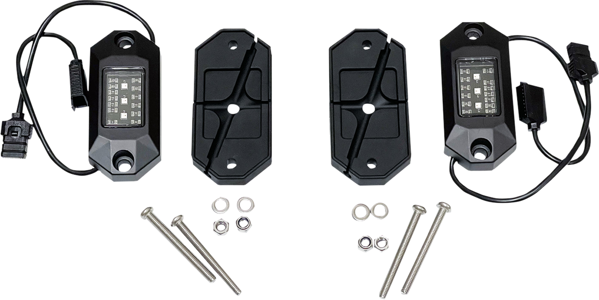 2 tough diecast light pods with three high-power RGB color changing lights eachEach light comes equipped with 6” wire leads on each sideWiring supplies, extensions and mounting hardware includedWorks on all 12VDC systemsPlug and play