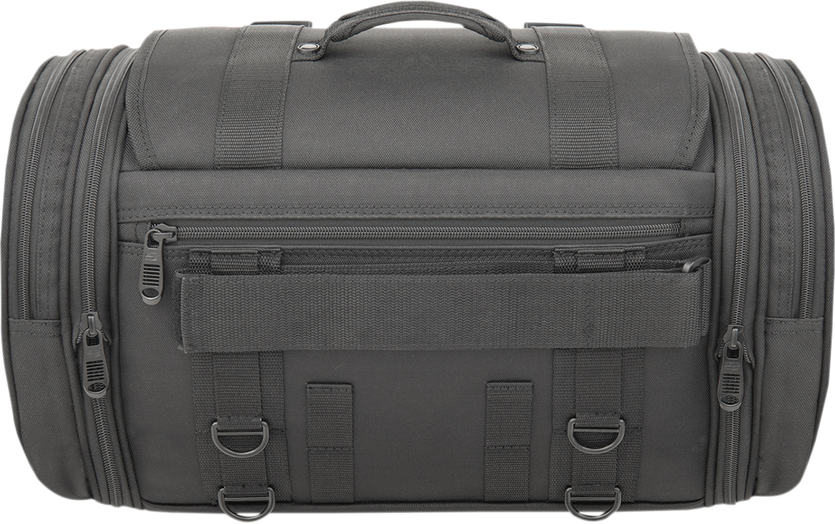 Dimensions: 18" wide x 11" deep x 10.5" tall (with an additional 3” expansion)Cubic Inches: 2,300UV-rated, weather-resistant 1200d chassisMaintains shape even when emptyWide zippered center opening assures ease of loading with large jacket or gear flapEnd pockets expand out providing additional packing room when neededInternal molded organizer and zippered mesh pockets keep items organizedEasy-mounted to sissy bar plus full mounting strap kit for a variety of mounting optionsAll strap end include our unique keepers system which eliminates the need for cutting after the bag is installedMultiple heavy-duty D-Rings for additional mounting or attaching optionsIntegrated MOLLE modular attachment points for storage customizationIncludes removable shoulder strap and carrying handle for transportation easeIncludes tethered rain cover for added protection from the elements