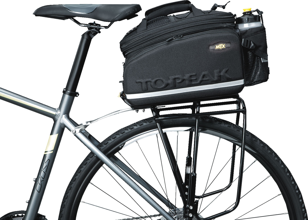 Features a divided main compartment, two zippered side pockets, and rear water bottle holderConstruction process combines molded panels and flexible fabric for rigidity and water repellencyCompatible with all MTX QuickTrack racksFeatures shoulder strap, carrying handle, elastic top bungees, 3M reflective strip, safety light clip, and optional rain cover