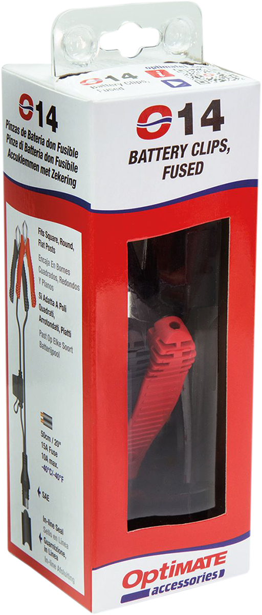 Battery clips with ‘easy grip’ rubber handlesCustom designed to fit round, square (power sport) and flat tab postsIndustry standard SAE 2-pin connectorCable max. ratings: 10 Amp20°C/-4°F low temperature useIncludes in-line rubber seal for OptiMATE heavy duty SAE connector