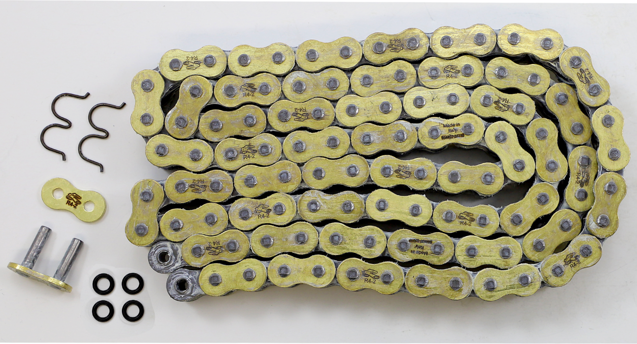 Incorporates SRS ring system (self-regulating seals) increasing chain longevityQuad riveting manufacturing processGold-anodized side plates help prevent corrosionComes pre-stretched from the factory so that frequent adjustments at the beginning of the chain's life are not neededEach chain includes master link/pair of latex gloves for easy installation