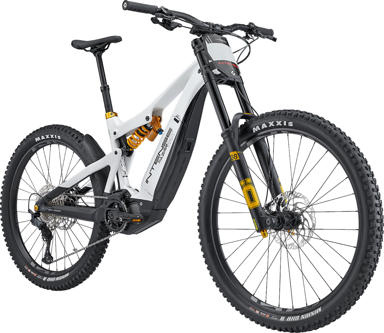 The INTENSE Tazer MX Pro build offers top of the line components with Shimanos most powerful and efficient motor, the EP8This bike is ready to tackle long trips through the back country or quick rides from your garageComes equipped with an hlins DH38 Race dual crown fork and a highly tunable hlins coil shockComes with a torque wrench and tool set for assemblyClass 1 e-BikeFrame Carbon fiber front and rear triangle with internal cable routingFork hlins DH38 Race fork, dual crown, 170 mm travel, air spring systemShock hlins TTX22M Coil, 155 mm travel, high/low speed compression adjustmentMotor Shimano Steps EP800 with 85 Nm of torqueBattery BT-E8010, for Steps, 504 Wh - Battery lock w/2 keys - up to 62 miles of range - up to 1000 recharge cycles without significant capacity lossDisplay Shimano Steps LCD, Bluetooth compatible - Rider customizable modesBrakes Magura MT7 with 203 mm Storm HC rotors front and backShifter Shimano SLX 12-speedDerailleur Shimano SLX 12-speedCranks E*thirteen E*spec 34 tooth chainring 165 mm lengthCassette Shimano Deore 12-speed 10-51 toothChain Shimano Deore 12-speedWheelset E*thirteen E*spec alloy rim 30 mm rim width x 29 front / 35 mm rim width x 27.5 rearHubs INTENSE E-specific alloy hubsTires Maxxis Minion DHR II Maxx Terra 3C EXO+ 29 x 2.60 Front / 27.5 x 2.8 RearSeatpost INTENSE Recon Dropper PostSaddle SDG Bel-Air V3 SaddleHandlebar INTENSE Recon 35 mm OD x 800 mm wide, 30mm riseStem INTENSE Direct Mount 35 mm OD x 50 mm lengthGrips ODI Elite FlowRear fender, underside bash guard and chainstay protectors also includedWeight 52 lbs 11 oz (size S/M, tubeless, with pedals)