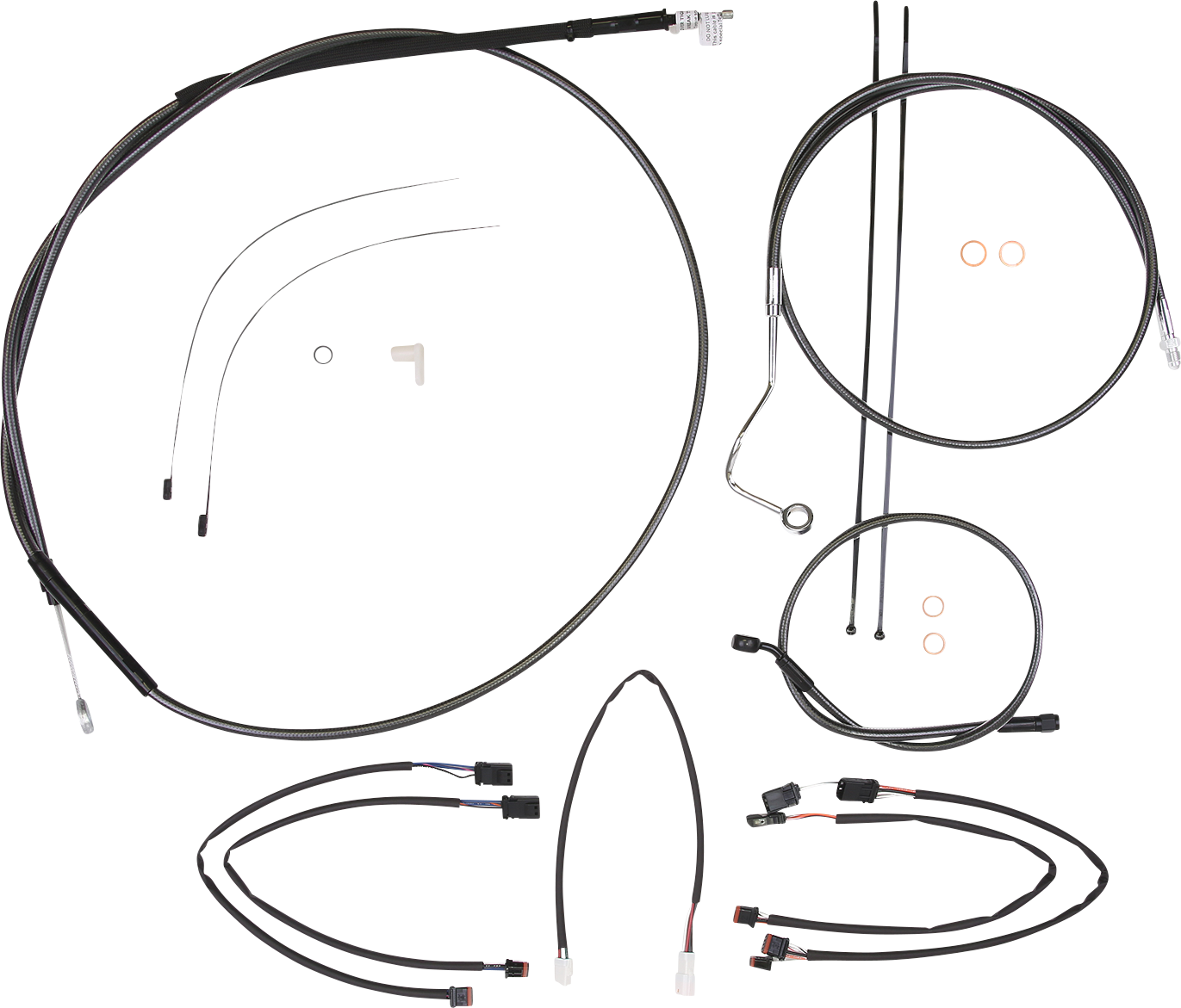 • Kit includes throttle and idle cables of throttle-by-wire extensions, clutch cable or hydraulic clutch line, brake lines, copper crush washers, hardware, and any necessary switch wiring of turn signal extension