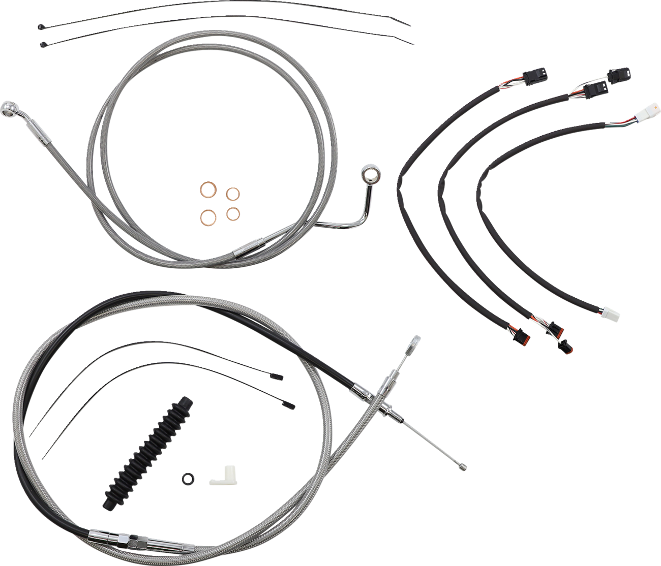 • Kit includes throttle and idle cables or throttle-by-wire extensions, clutch cable or XR hydraulic clutch line, XR brake lines, copper crush washers, hardware, turn signal and switch wiring extensions