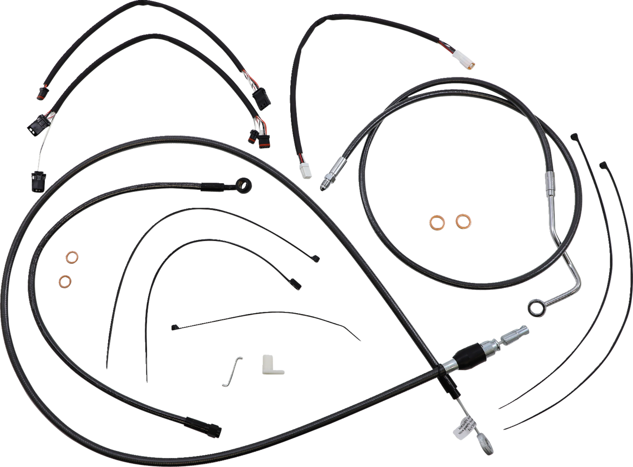 • Kit includes throttle and idle cables of throttle-by-wire extensions, clutch cable or hydraulic clutch line, brake lines, copper crush washers, hardware, and any necessary switch wiring of turn signal extension