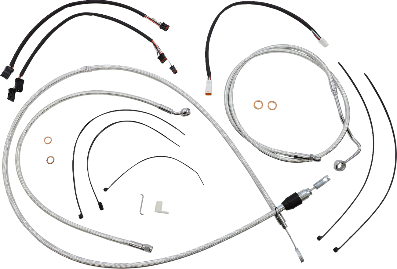 Kit includes throttle and idle cables of throttle-by-wire extensions, clutch cable or hydraulic clutch line, brake lines, copper crush washers, hardware, and any necessary switch wiring of turn signal extension