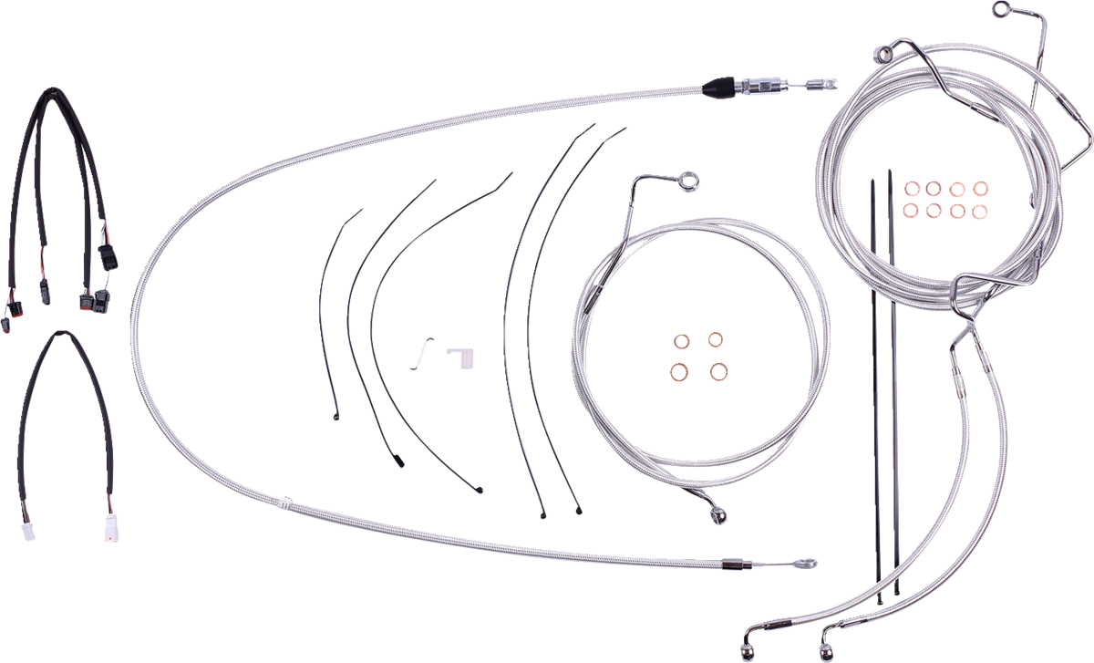 • Kit includes throttle and idle cables of throttle-by-wire extensions, clutch cable or hydraulic clutch line, brake lines, copper crush washers, hardware, and any necessary switch wiring of turn signal extension