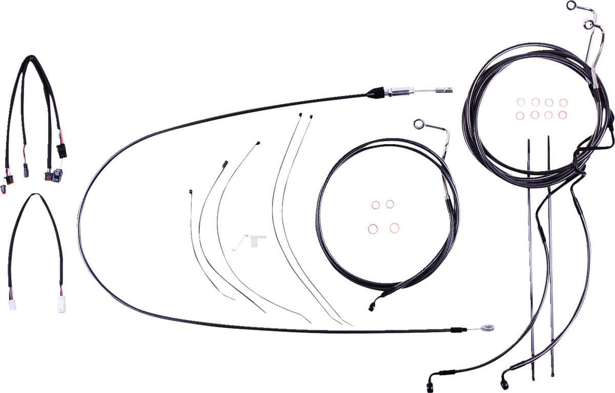 • Kit includes throttle and idle cables of throttle-by-wire extensions, clutch cable or hydraulic clutch line, brake lines, copper crush washers, hardware, and any necessary switch wiring of turn signal extension