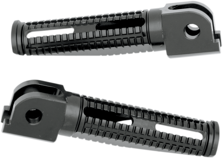 CNC-machined from 6061 T-6 billet aluminum; replace stock footpegsLighter than stock, slash cut for greater ground clearance; have machined, not knurled, grooves for better gripSpecs