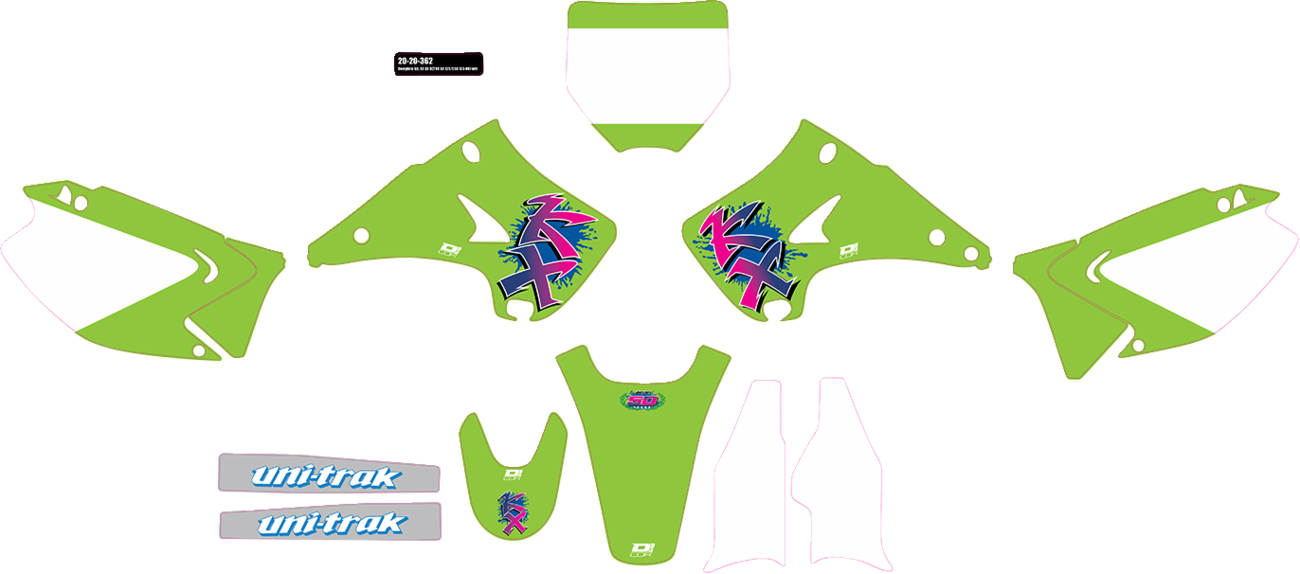 Includes decals for radiator shrouds, tank, number plate, airbox, lower fork guards, front fender, rear fender and swingarmSpecs