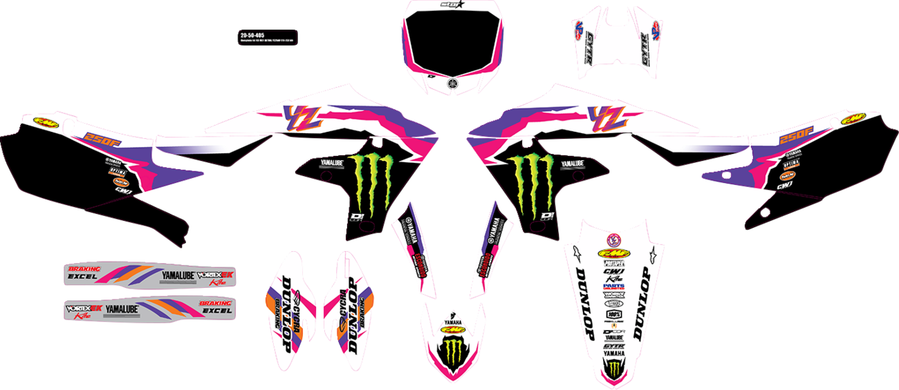 Includes decals for radiator shrouds, tank, number plate, airbox, lower fork guards, front fender, rear fender and swingarmSpecs