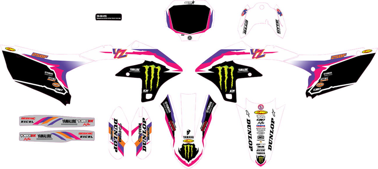 Includes decals for radiator shrouds, tank, number plate, airbox, lower fork guards, front fender, rear fender and swingarmSpecs
