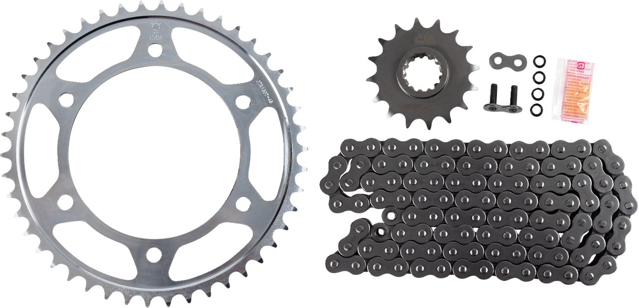 Low Friction X-Ring® ChainChromoly Steel Front SprocketHigh Carbon Steel Rear SprocketThe X-Rings twist between the side plates instead of being squished to reduce friction and minimize power lossHigh carbon rear sprockets are heat treated for maximum durability and long lifeCountershaft sprockets are made from chromoly steel for superior strength and durabilitySpecs