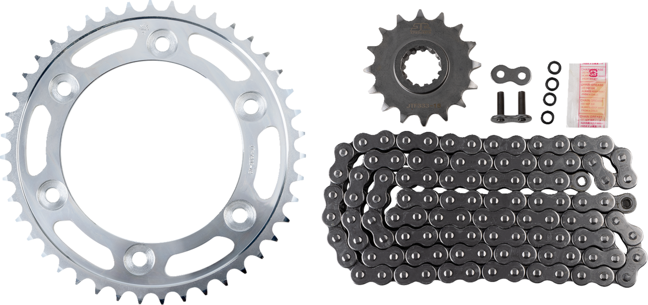 Low Friction X-Ring® ChainChromoly Steel Front SprocketHigh Carbon Steel Rear SprocketThe X-Rings twist between the side plates instead of being squished to reduce friction and minimize power lossHigh carbon rear sprockets are heat treated for maximum durability and long lifeCountershaft sprockets are made from chromoly steel for superior strength and durabilitySpecs