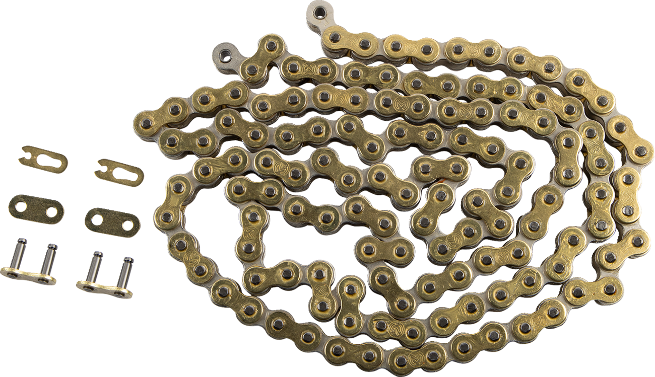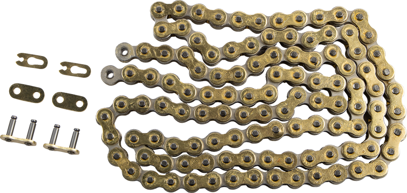 Non-O-ring chainDesigned specifically for mini-racing machinesHigh application greased chainHigh-tensile strength nickel-plated inner link platesHigh-tensile rust-resistant gold-plated side plates