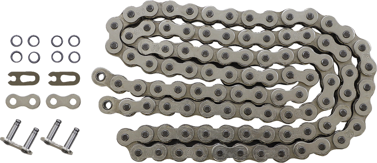 O-ring chainExtra-high-tensile-strength link platesRust-resistant nickel-plated side platesVacuum-injected greased chainSolid bushingsRecommended for applications between 350-450ccClip-type connecting link includedReplacement connecting link available