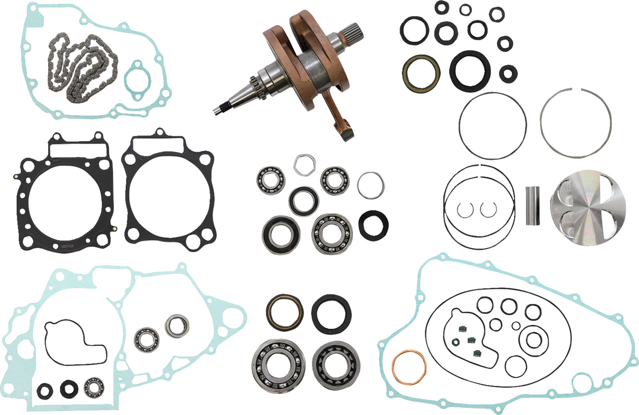 • Includes crankshaft, piston kit, complete engine gasket kit with oil seals, main bearings and seals, water pump rebuild kit, transmission bearings, countershaft bushing/seal kit, cam chain and counter balancer bearings when applicable