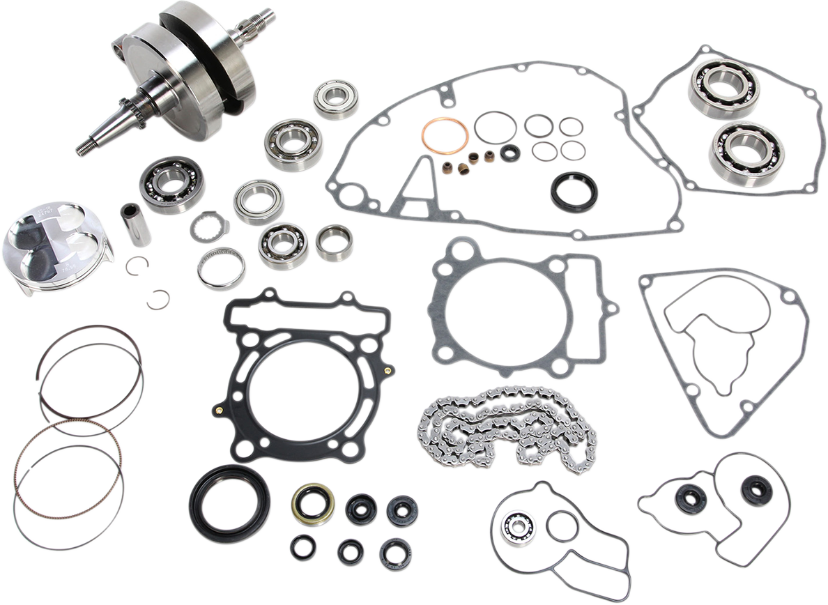 • Includes crankshaft, piston kit, complete engine gasket kit with oil seals, main bearings and seals, water pump rebuild kit, transmission bearings, countershaft bushing/seal kit, cam chain and counter balancer bearings when applicable