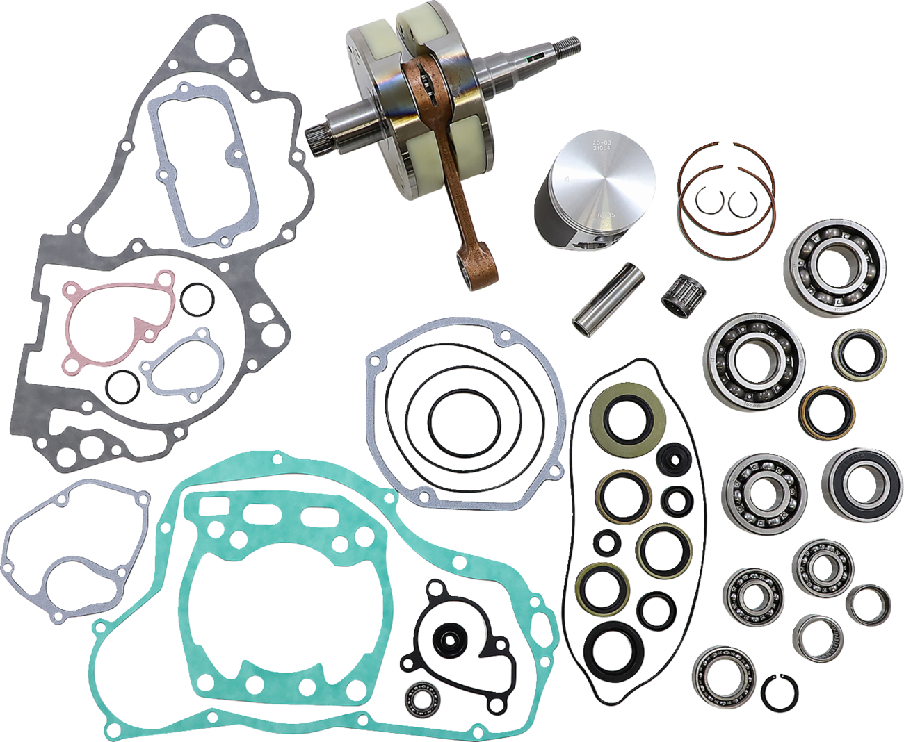 Convenient one-stop shop in a box; nearly all components required for a complete and professional rebuildVertex piston kit (standard compression piston, rings, pin and clips)Hot Rods heavy-duty crank (stock stroke with wrist pin bearing)Hot Rods main bearing/seal kitHot Rods transmission bearing kit (includes transmission bearings, output shaft collar and sprocket lock washer)Hot Rods counter balancer bearing kitHot Rods water pump bearing and seal kitVertex complete gaskets kit, including seals and O-ring kit (covers top and bottom)Specs