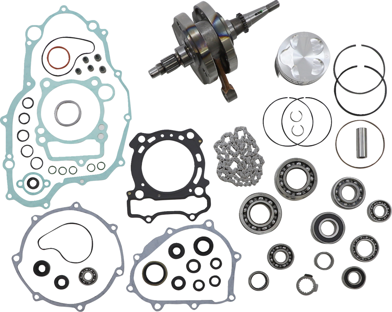 • Includes crankshaft, piston kit, complete engine gasket kit with oil seals, main bearings and seals, water pump rebuild kit, transmission bearings, countershaft bushing/seal kit, cam chain and counter balancer bearings when applicable
