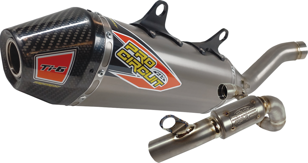 Offering maximum performance while meeting AMA amateur noise requirementsIdeal for closed-course or off-road racingTitanium construction throughout head pipe, mid pipe and canisterCarbon fiber end-cap constructionEquipped with RC-4 Resonance Chamber to reduce noise outputAsymmetrical muffler configuration for increased packing volumeMachined aluminum muffler bracket for increased strength and durabilityMachined mid pipe to head pipe joint for a better, leak free fitRemovable USFS approved spark arrestorTIG precision weldingMade in the U.S.A.Specs