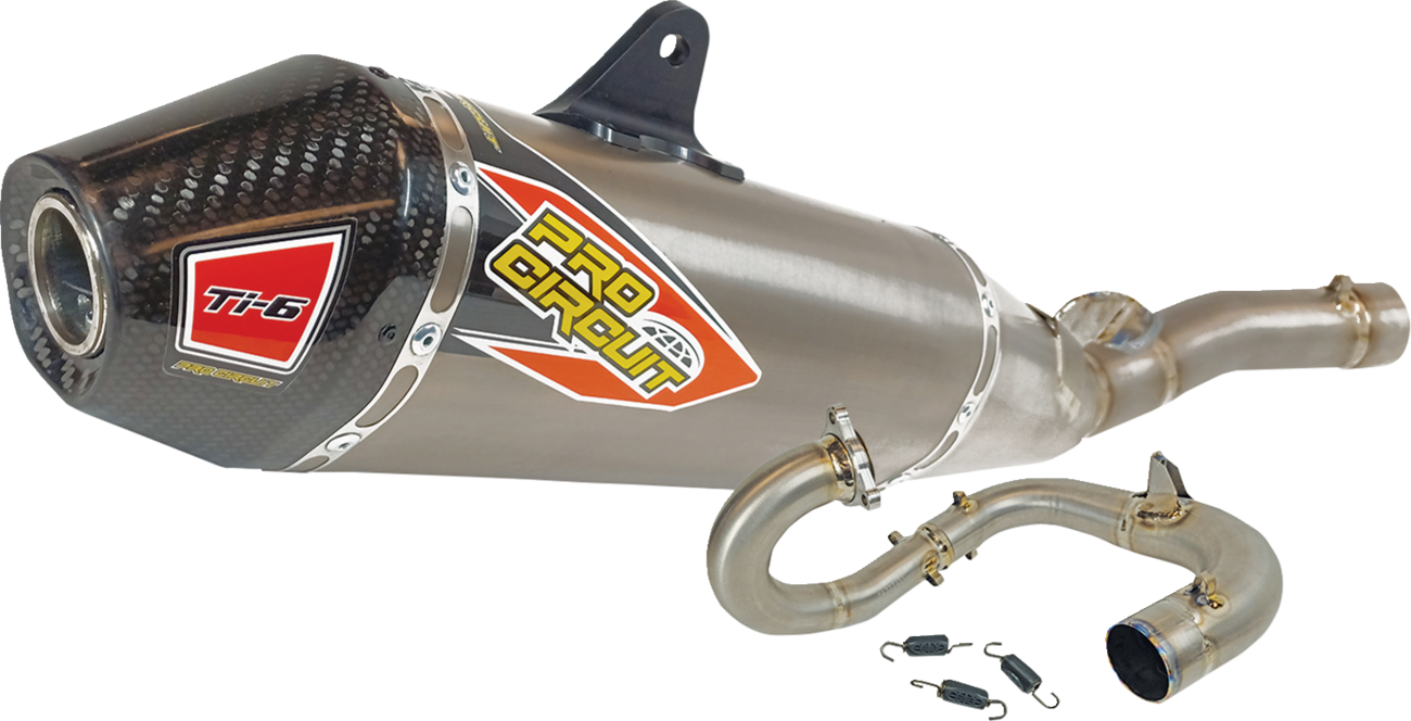 Offering maximum performance while meeting AMA amateur noise requirementsIdeal for closed-course or off-road racingTitanium construction throughout head pipe, mid pipe and canisterCarbon fiber end-cap constructionMachined aluminum muffler bracket for increased strength and durabilityAsymmetrical muffler configuration for increased packing volumeRemovable USFS approved spark arrestorTIG precision weldingMade in the U.S.A.Specs