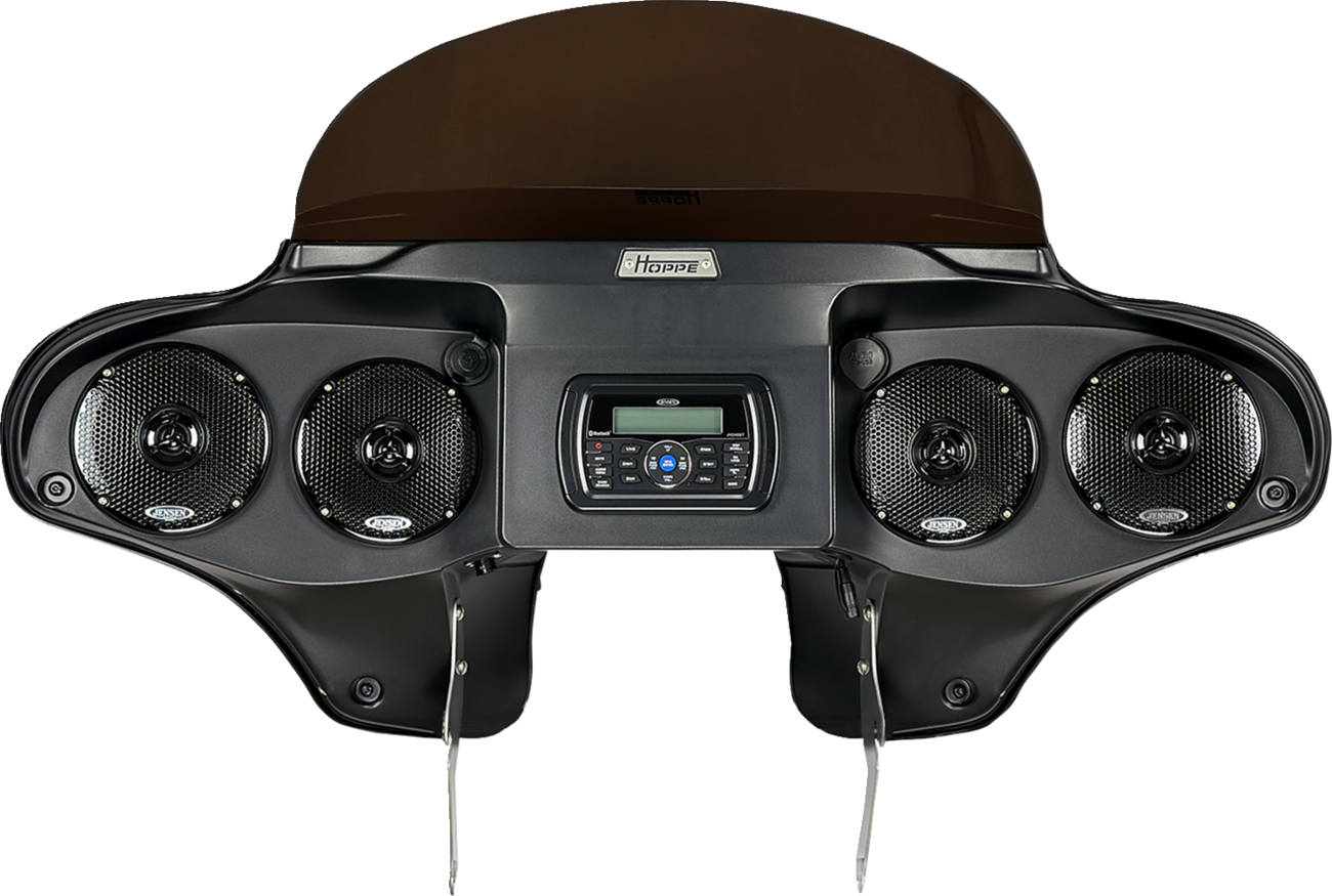 OEM quality injection molded plastic inner and outer fairingUV stable, won’t become brittle or fade in the sun like ABS plasticFully assembledLightly textured inner fairing for OEM look / feel. Can be painted for custom applicationsBrackets included. Just mount to forks at stock windshield docking pointsPolished outer fairing for easy paint applicationJust add power, ignition, and ground. Quick disconnect plug is includedConcealed internal antenna for a clean lookIncludes 12" Clear windshieldHand controls includedWill accept any '14 up HD batwing OEM or aftermarket windshield, windshield trim, vent trim, or wind deflectorsMade in U.S.A.Head UnitWaterproofAM/FM radioUSB / Aux inputPre-amp output for easy upgrading laterBluetooth wireless audio / handsfree phoneSpecs