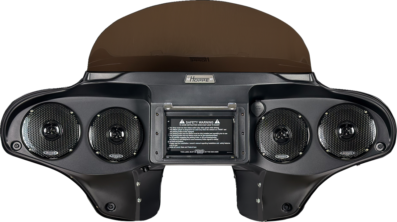 OEM quality injection molded plastic inner and outer fairingUV stable. Won’t become brittle or fade in the sun like ABS plasticPolished outer fairing for easy paint applicationLightly textured inner fairing for OEM look / feel. Can be painted for custom applicationsFully assembledBrackets included. Just mount to forks at stock windshield docking pointsJust add power, ignition, and ground. Quick disconnect plug is includedConcealed internal antenna for a clean lookIncludes 12" Clear windshieldWill accept any '14 up HD batwing OEM or aftermarket windshield, windshield trim, vent trim, or wind deflectorsMade in U.S.A.Waterproof 6-3/4” ScreenFront, rear, and sub pre-amp outputs for easy upgradingApple Car Play/Android Auto compatible (USB only)320 WBluetooth wireless audio/handsfree phoneAM/FM radioUSB/Aux inputSpecs