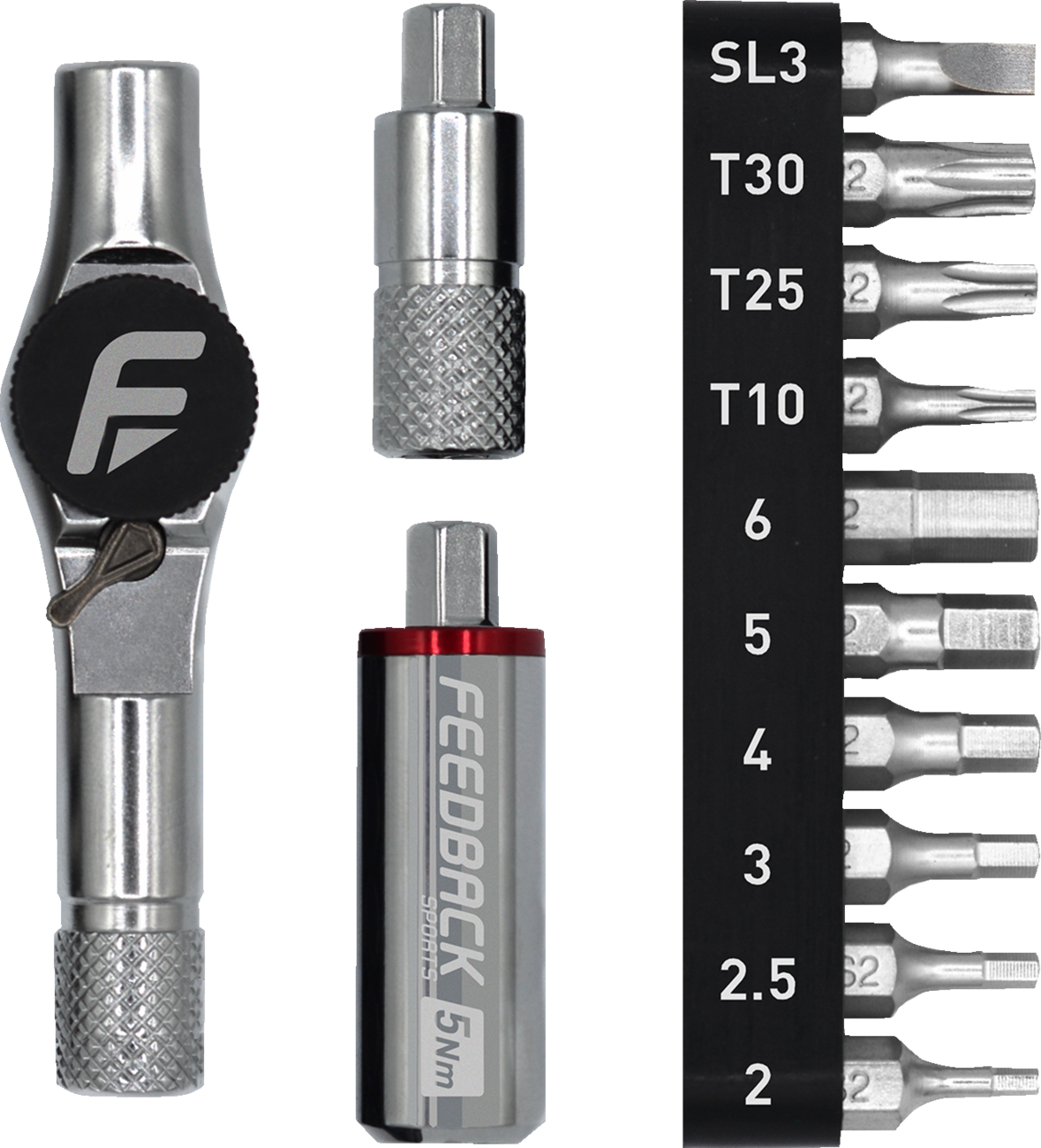 Kit includes ratchet handle, 25 mm extension, 5 Nm click-torque extension, and 10 bitsRatchet wrench for speed; torque extension for precisionPortable and light - easily fits in a jersey pocket, ride pack or travel kit5 Nm click-torque extension for safe, precise and secure tightening of sensitive parts2-way ratchet wrench can be used without torque extension for rapid fastener take-up and looseningBit extender can be used in "T" handle, "L" handle, or "I" handle (in-line) configuration to suit any task6-degree ratchet engagement maneuvers in tight spacesCompact head and bit design allows clearance and full function in tight spaces10 labeled S2 Steel bits covering the most common bicycle applicationsS2 Steel is an industry leading tool steel made for precise edges, exact fitment, and durable working surfacesHex: 2 mm, 2.5 mm, 3 mm, 4 mm, 5 mm, 6 mmTorx®: T10, T25, T30Flat: 3 mm